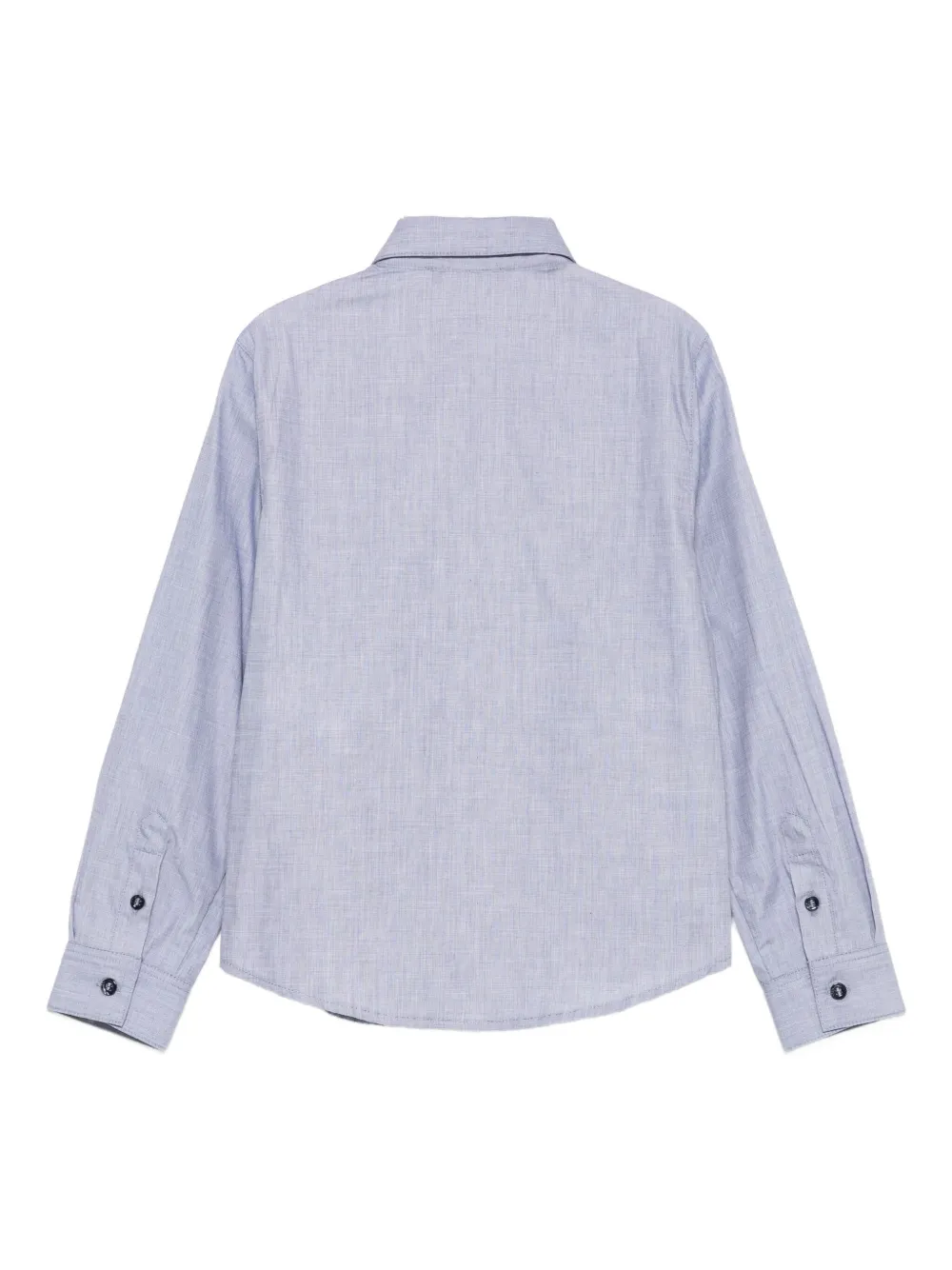 Светло-голубой, с длинными рукавами, застежкой на пуговицы, нагрудным карманом, вышитым логотипом, заостренным воротником.