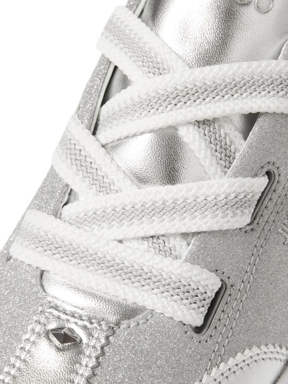 Кожаная вставка с серебристыми блестками, застежка на шнуровку, резиновая подошва.