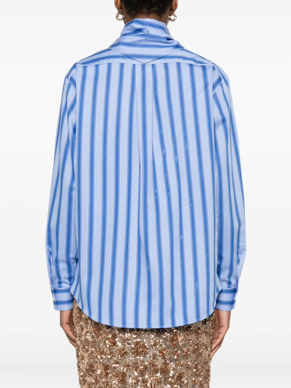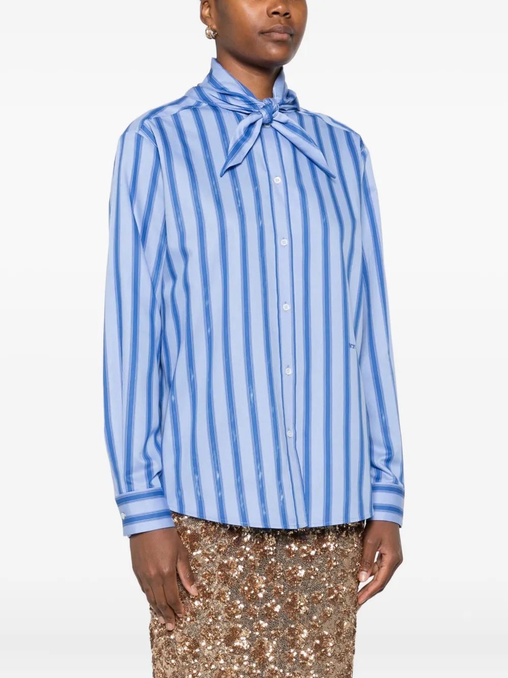 Синий полосатый узор, завязка на шее, застежка на пуговицы, вышитый логотип, длинные рукава, закругленный подол.