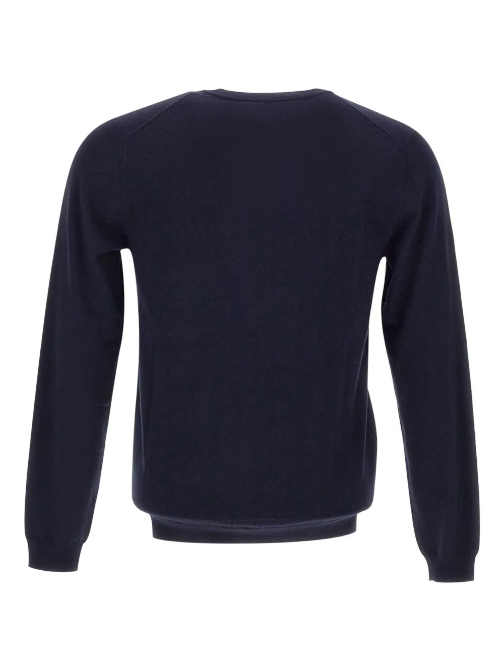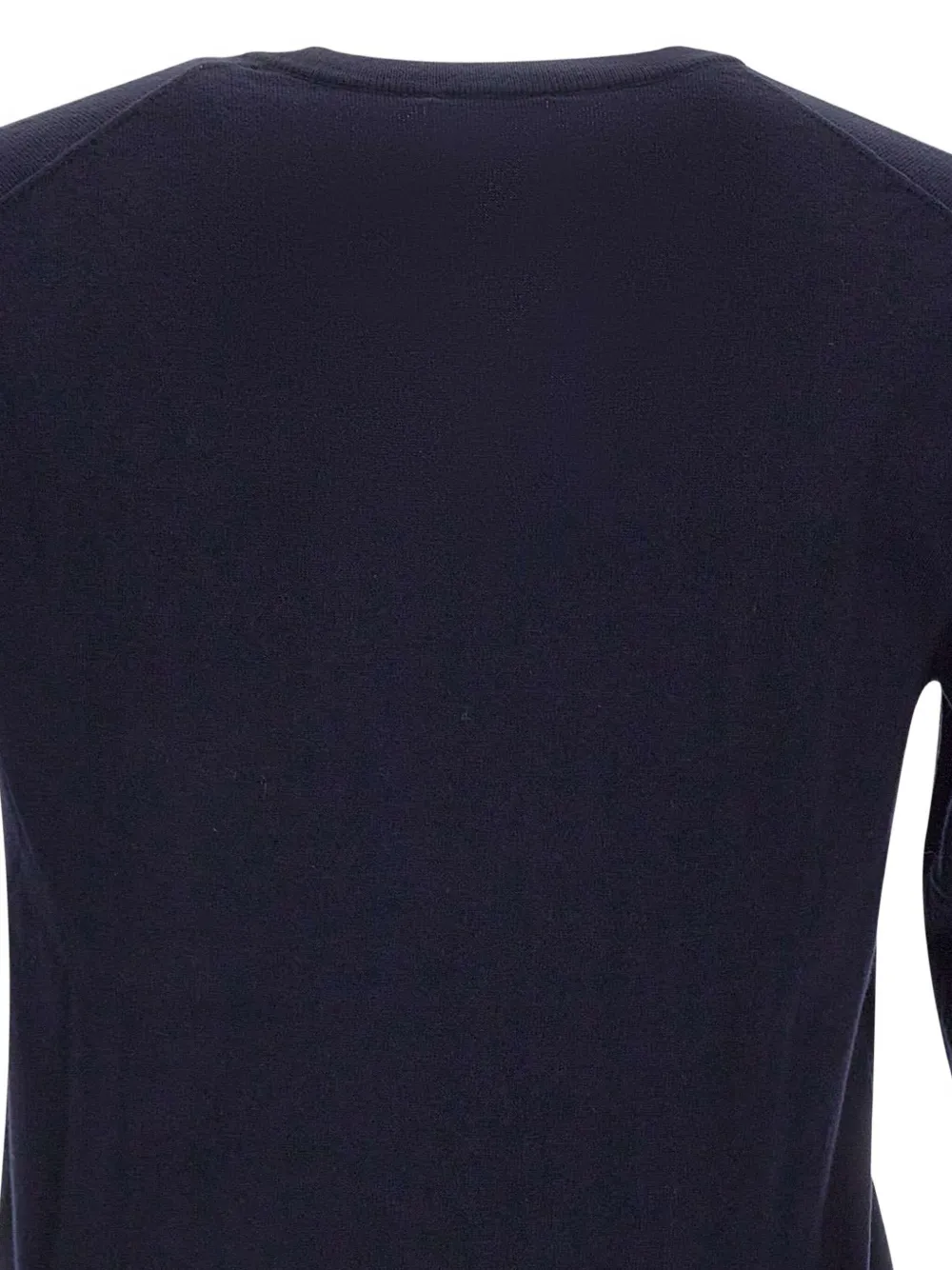 Темно-синий V-образный вырез, ребристые края, длинные рукава, вышитый логотип.