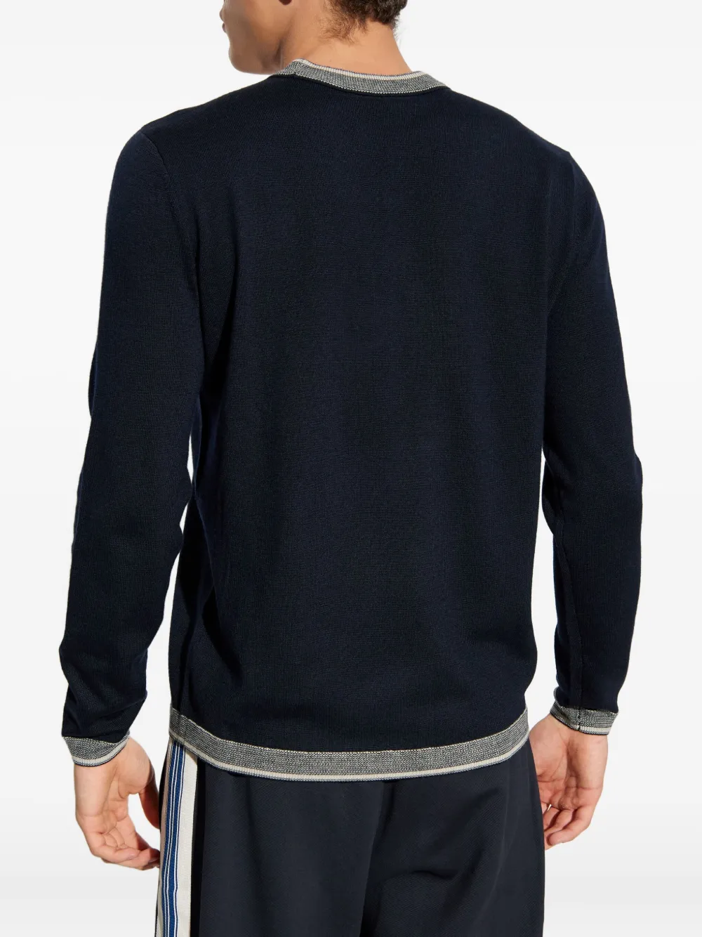 Темно-синяя шерстяная модель с вышитым логотипом, круглым вырезом в рубчик, серыми ребристыми отделками и длинными рукавами.