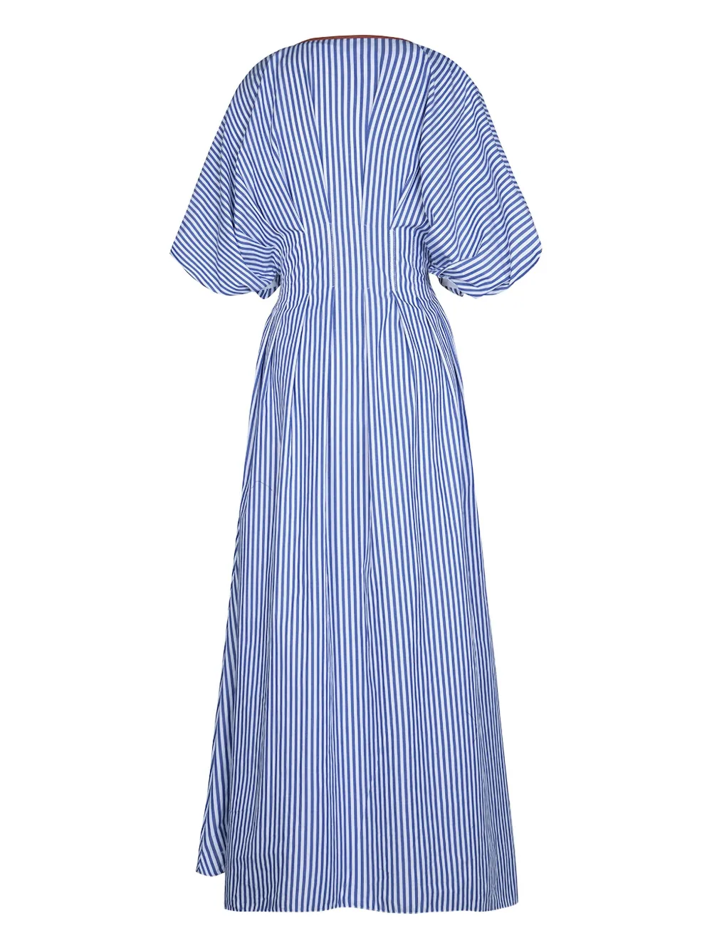 Синие вертикальные полосы, завязка, короткие рукава, застежка на пуговицы, присборенная талия.