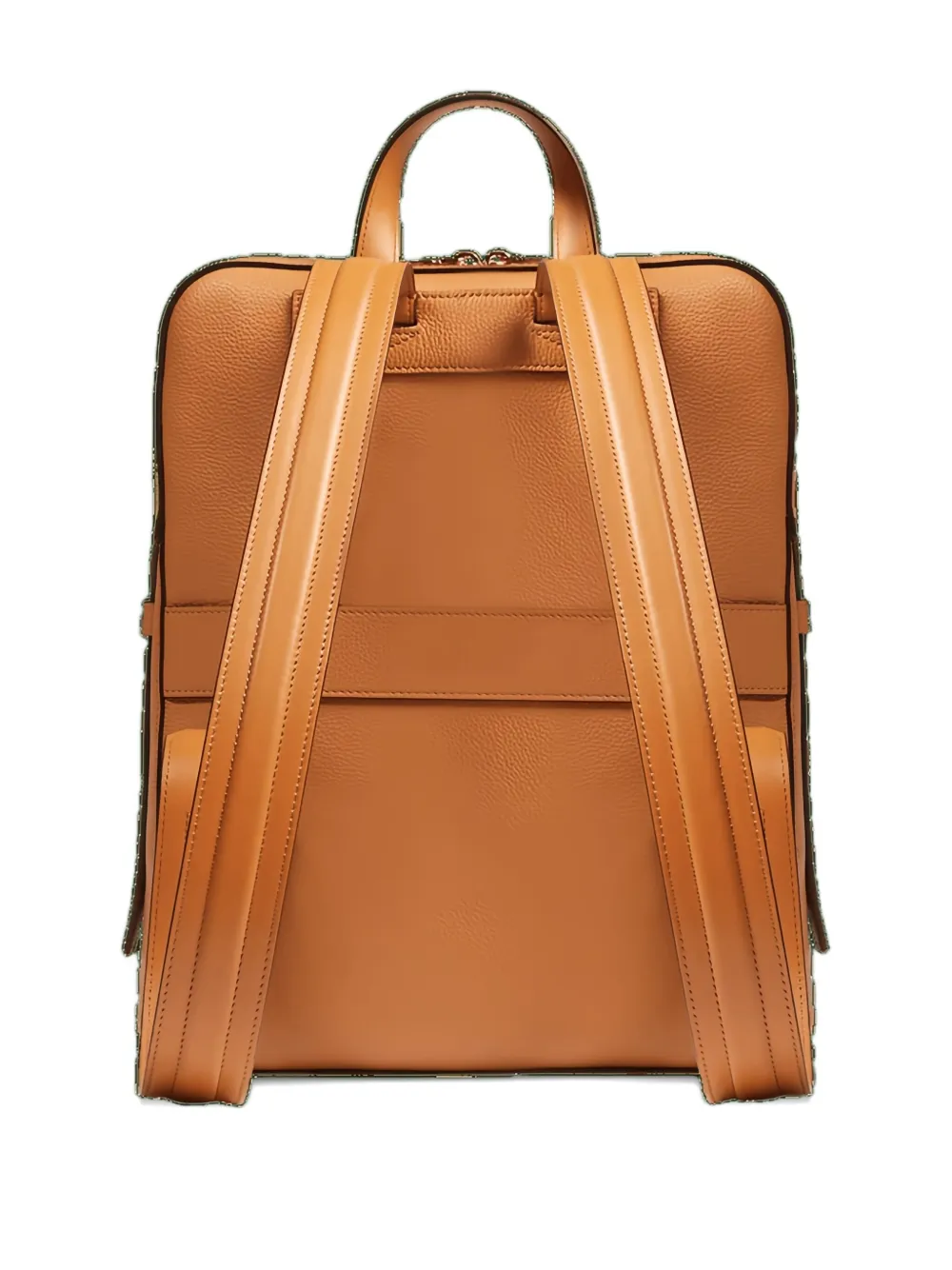 Светло-коричневая кожа, геометрический дизайн панелей, застежка-молния, регулируемые плечевые ремни, круглая ручка сверху.