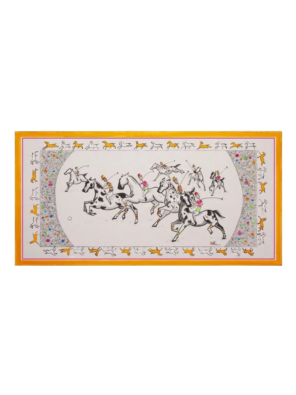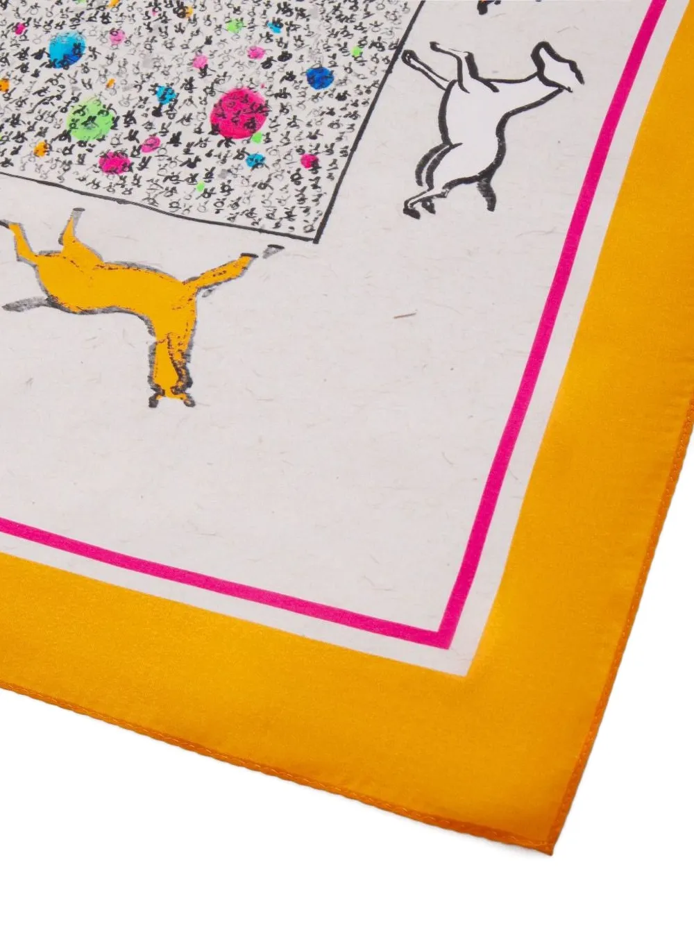 Солнечный желтый конный принт с разноцветными деталями, оранжевая кайма, шелковый материал, нарисованный вручную