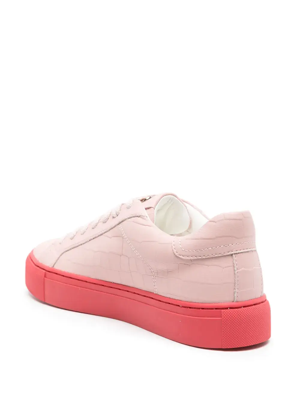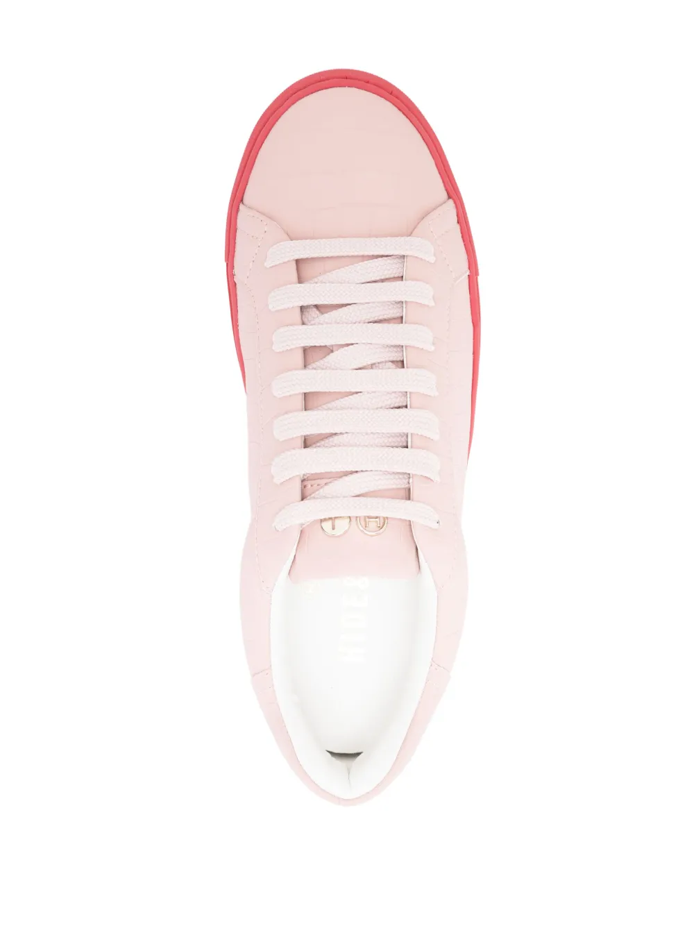 Розовый, телячья кожа, тиснение под кожу крокодила, закругленный носок, шнуровка спереди, нашивка с логотипом на язычке, стелька с логотипом и плоская резиновая подошва.
