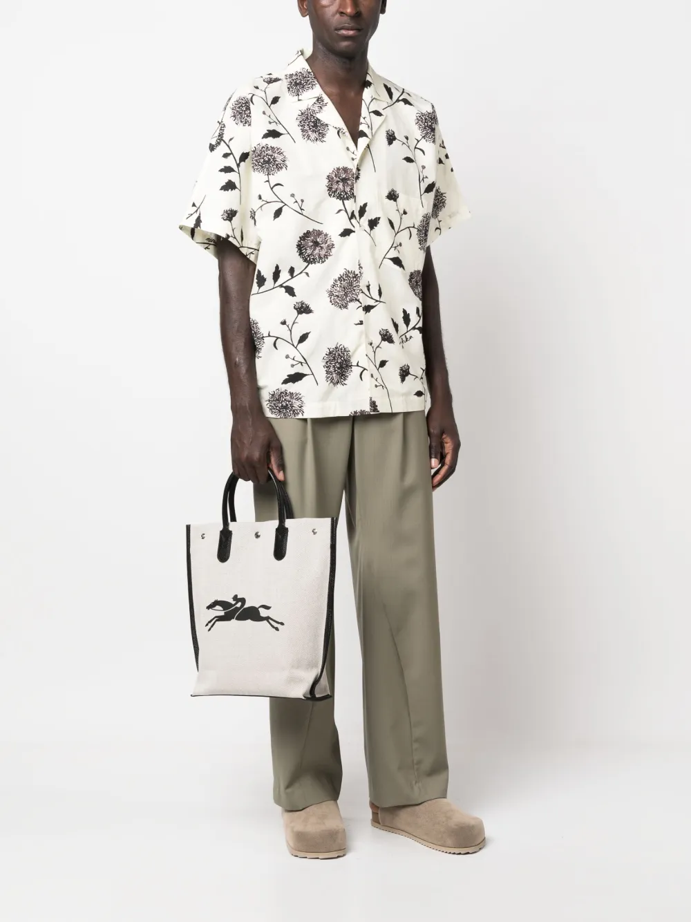 Экрю, канвас/кожа, логотип спереди, принт с логотипом сзади, кант с кожаной отделкой, застежка на кнопках спереди, две верхние ручки, внутренний карман на молнии и основное отделение.