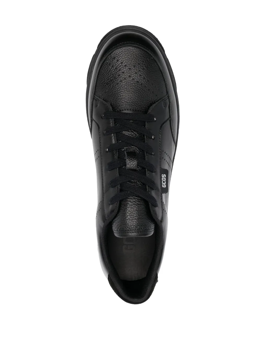 Черный, телячья кожа, логотип сбоку, принт с логотипом сзади, шнуровка спереди, перфорация, закругленный носок и резиновая подошва.