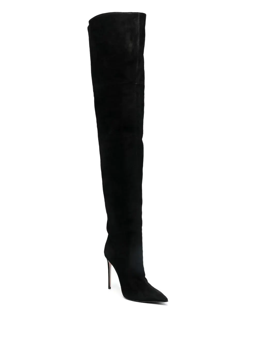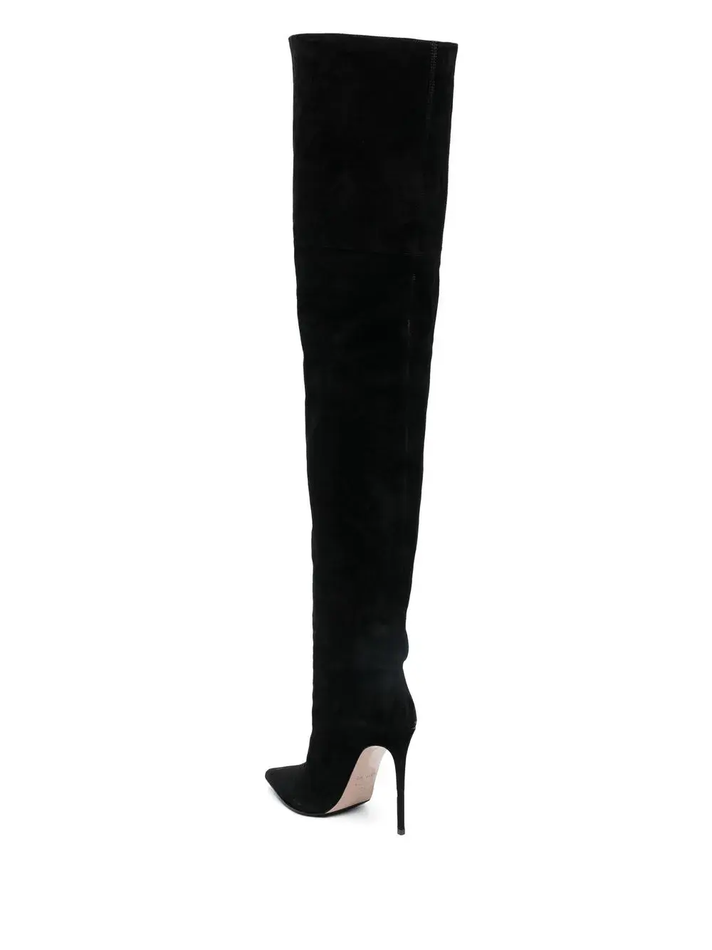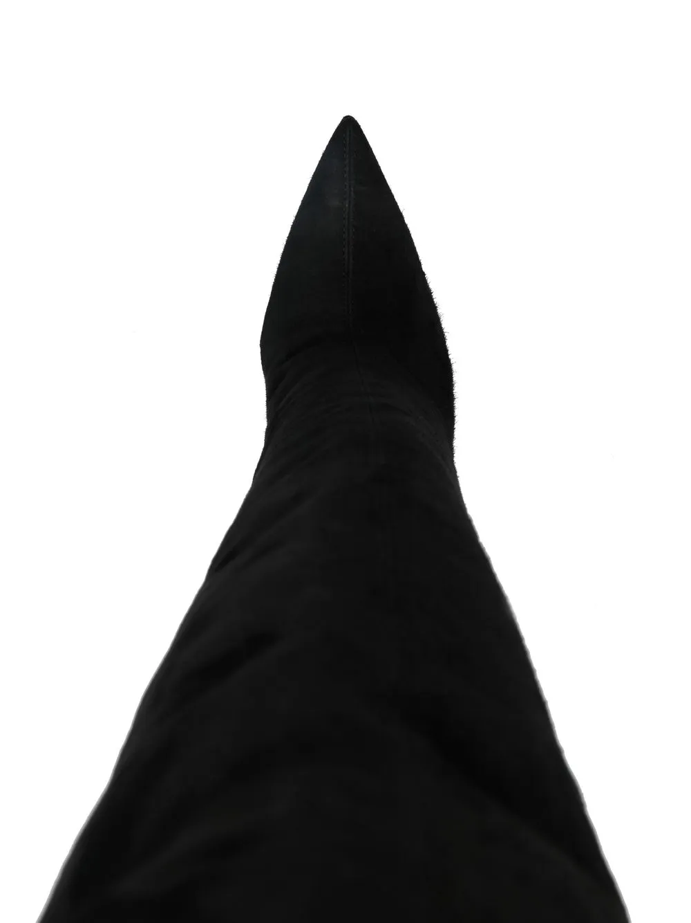 Черный, замша, заостренный носок, каблук на высокой шпильке, высота по колено и модель без застежки.