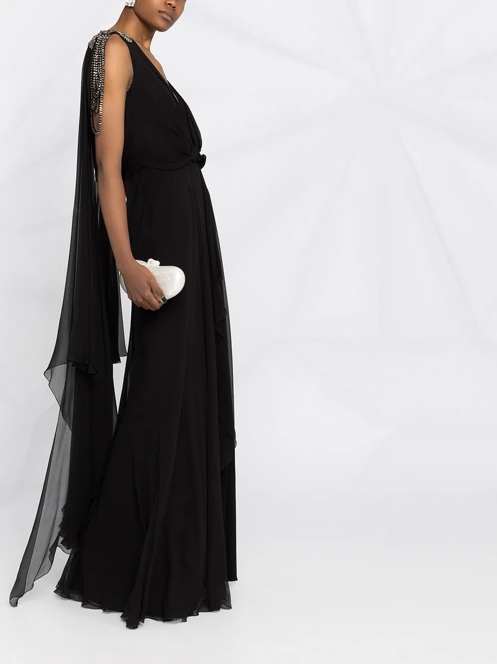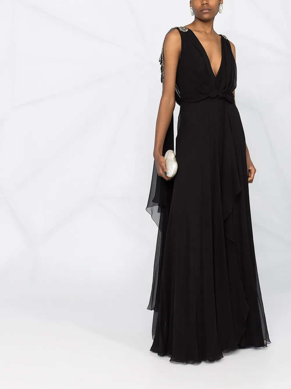 Глубокий V-образный вырез, без рукавов, декор из кристаллов, длина макси и завышенная талия. Цвет: черный.