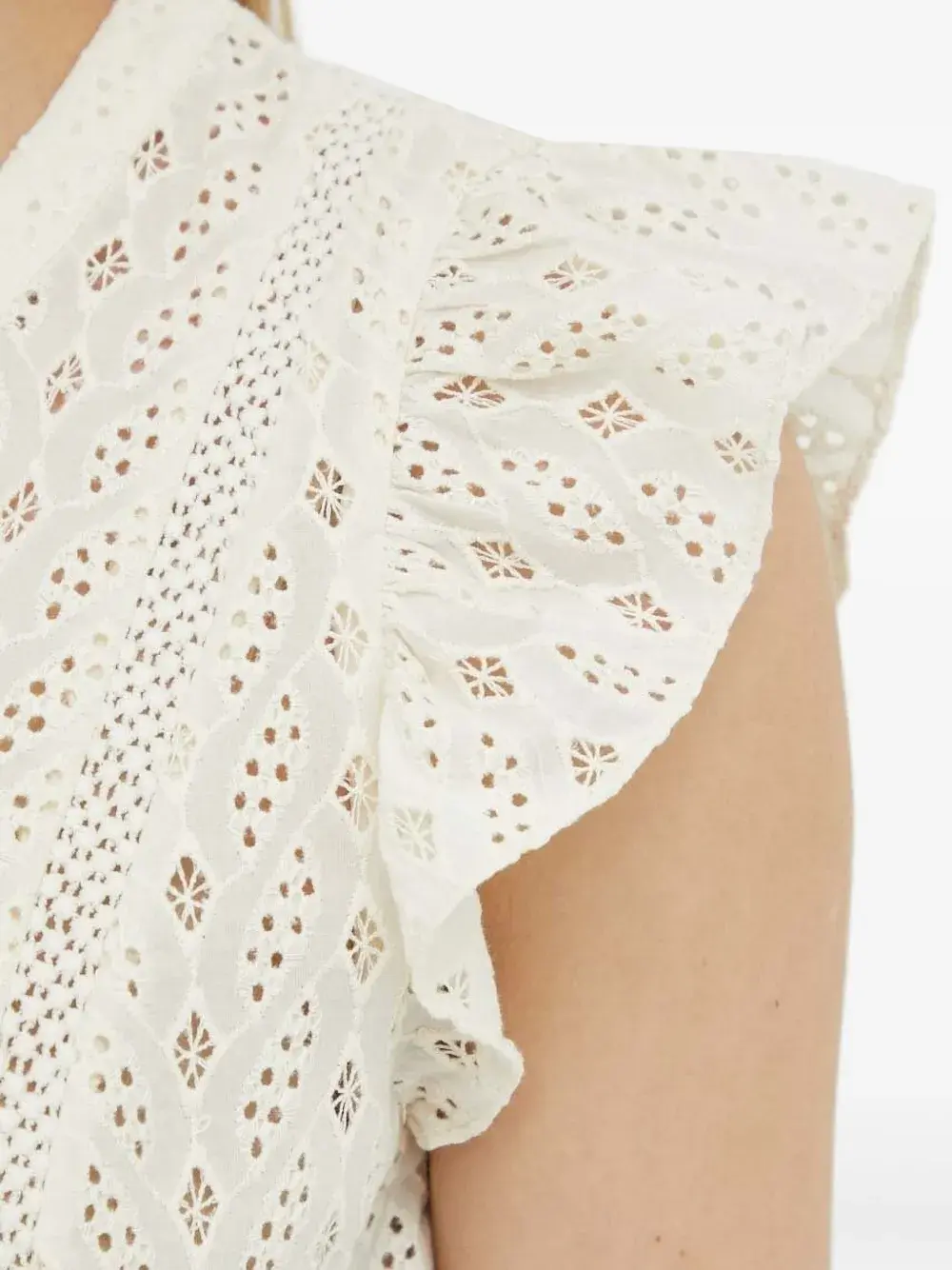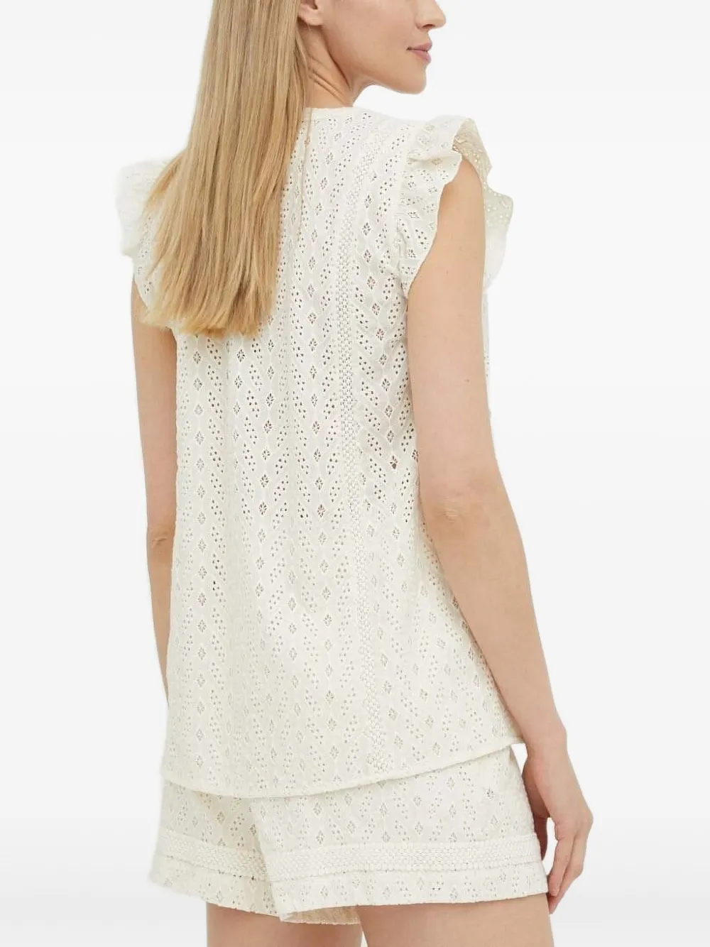 Белый узор с люверсами, V-образный вырез, рукава с оборками, планка с пуговицами, короткие рукава.