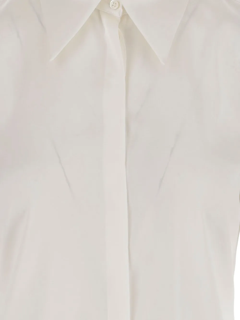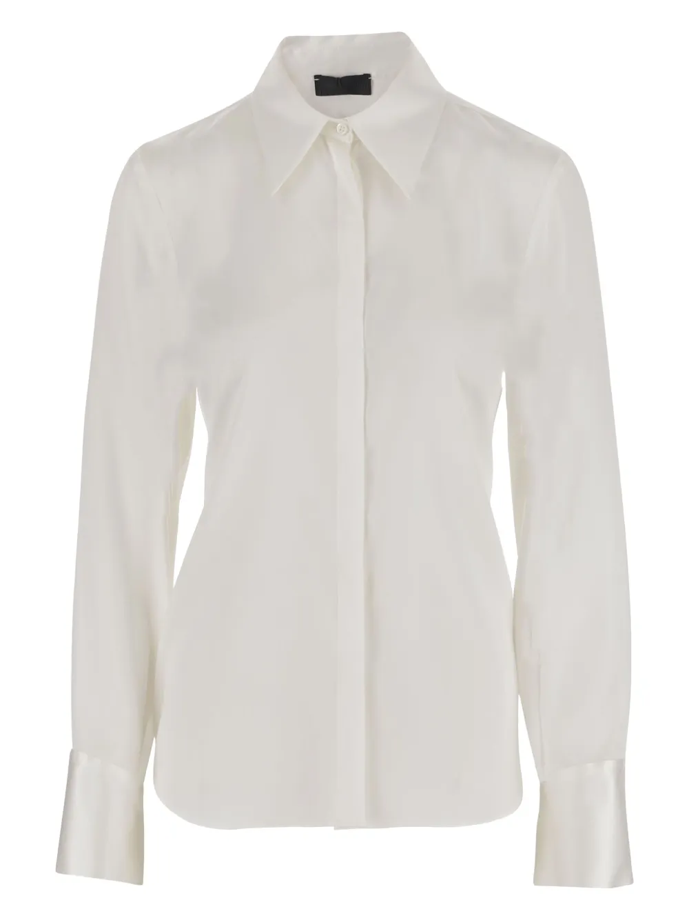Рубашка из эластичного шелка Острый воротник Длинные рукава Манжеты на пуговицах Скрытая застежка на пуговицы спереди Приталенный крой Закругленный подол Белый Сделано в Италии Состав: 97% шелк, 3% эластан