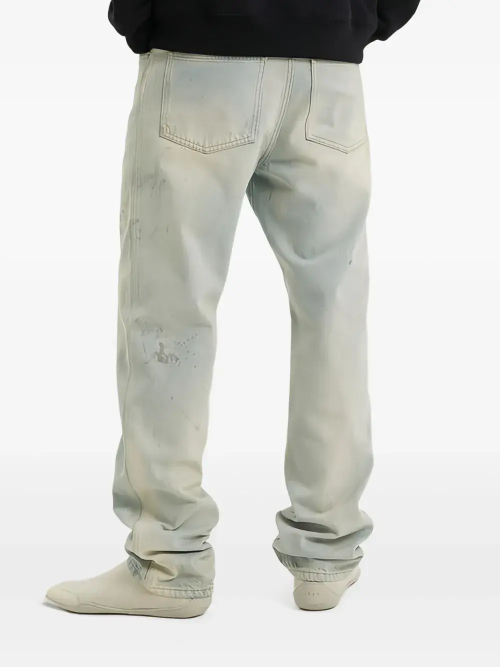 Светло-голубой выцветший дизайн с пятью карманами, шлевками для ремня, застежкой на молнию и пуговицы.