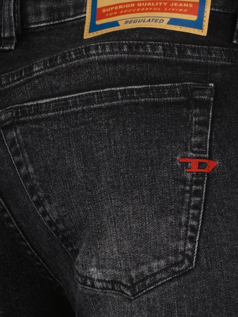 Черная выцветшая ткань, пять карманов, застежка на пуговицы, нашивка с логотипом