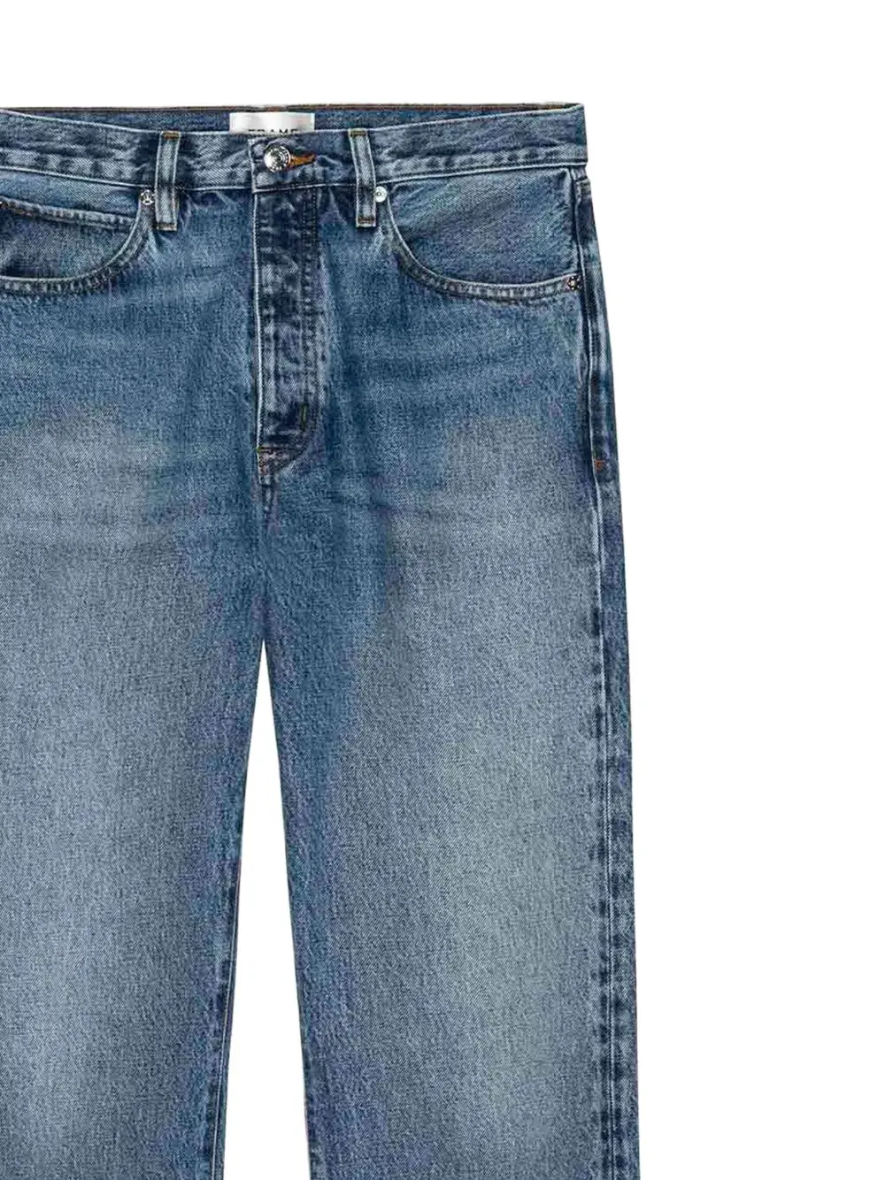 Синяя выцветшая ткань, пять карманов, застежка на пуговицы, шлевки для ремня