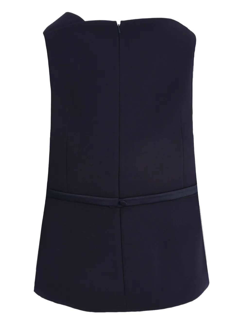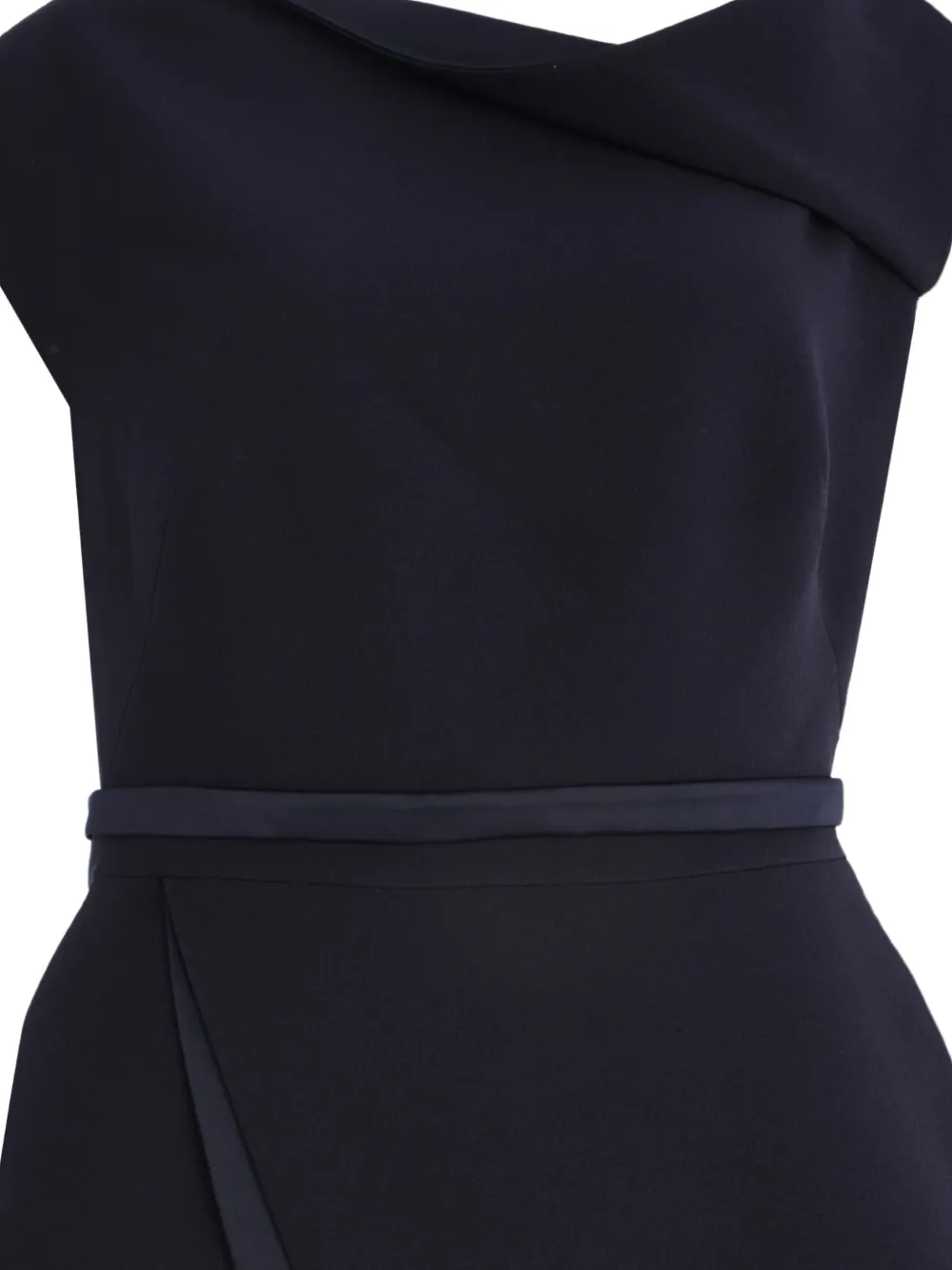 Темно-синий асимметричный вырез горловины, отложной воротник, баска, пояс на талии, без рукавов