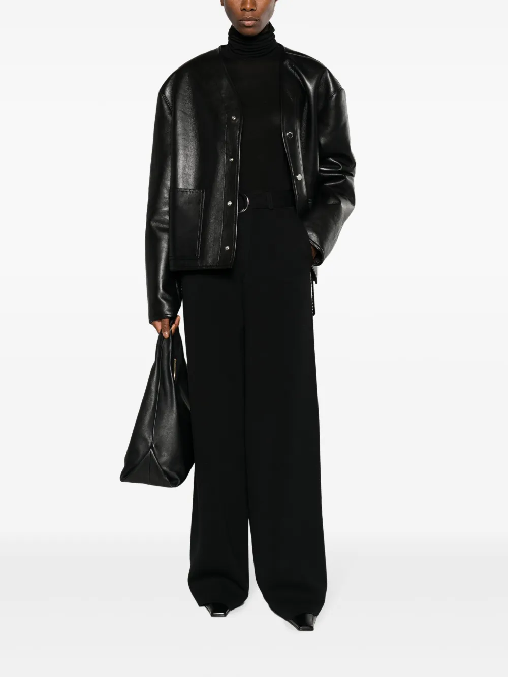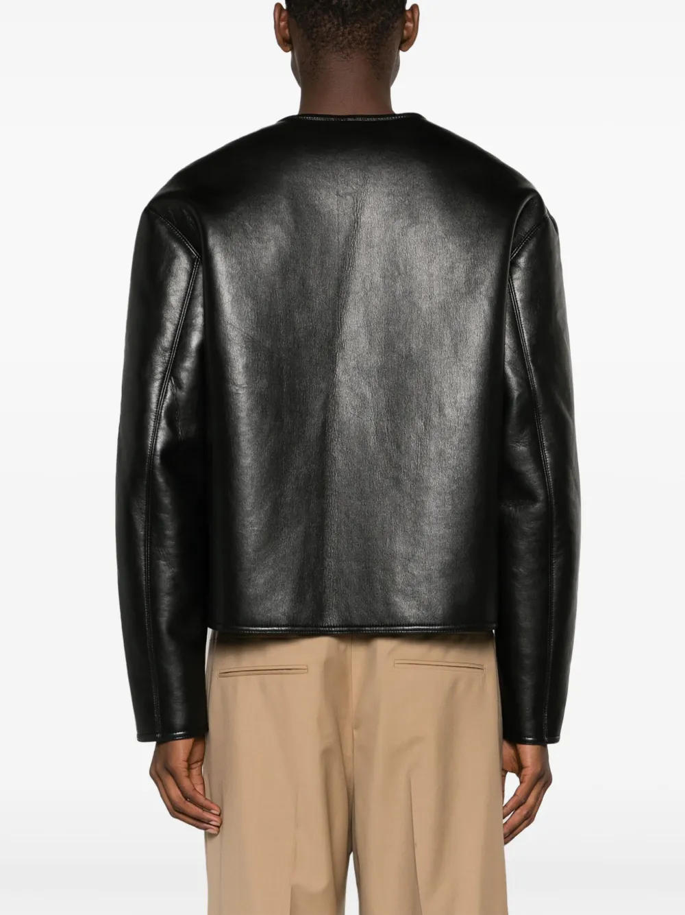 Черный, искусственная кожа, V-образный вырез, застежка на кнопках спереди, длинные рукава и прямой подол. Это унисекс-модель. Обратите внимание, что для нее используется мужская размерная сетка. . Узнать больше о том, какие товары получают отметку «Ответственный выбор», можно из материала «Как мы оцениваем экологичность и этичность».