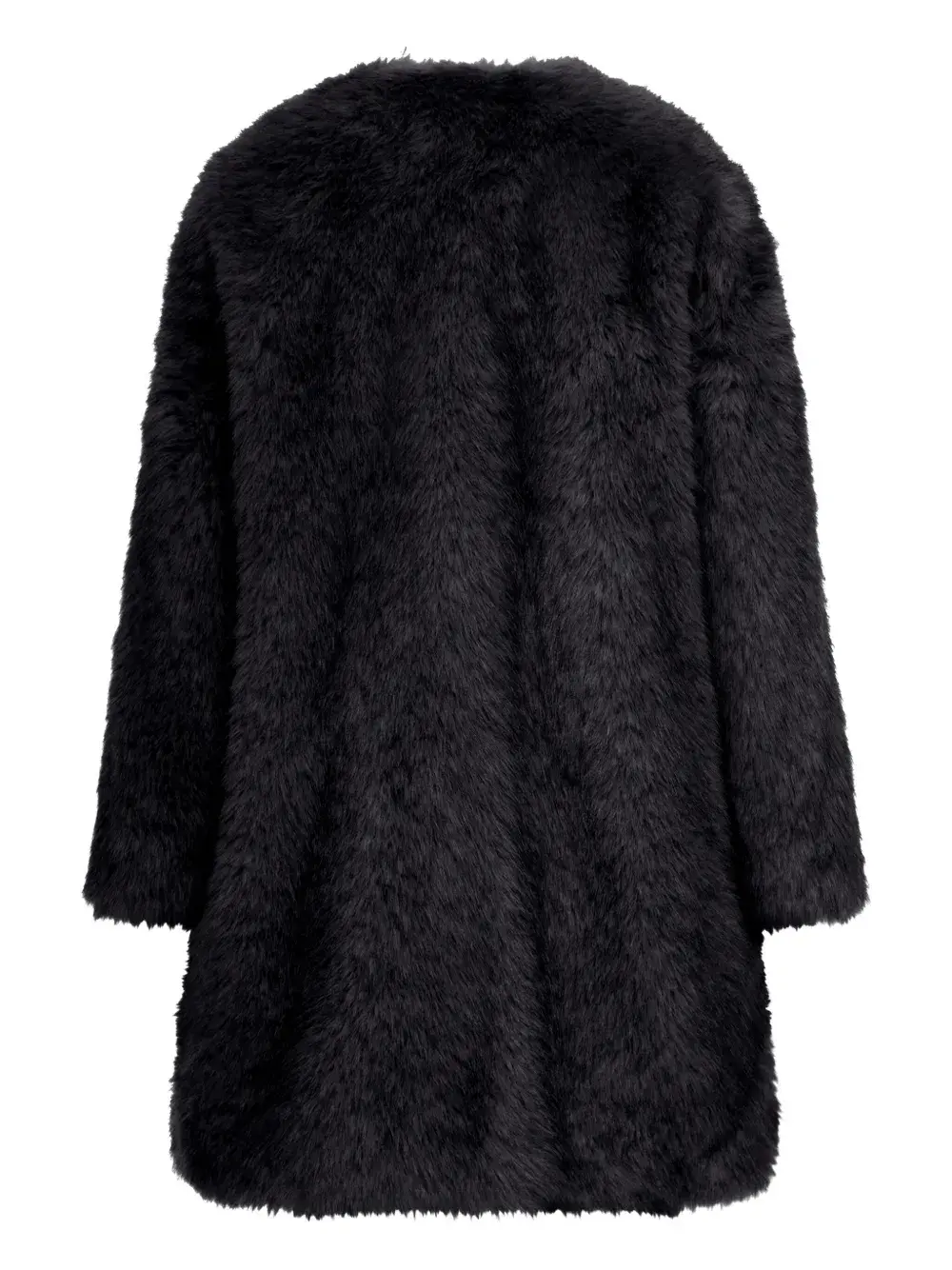 Черный искусственный мех, длинные рукава, круглый вырез, прямой подол.