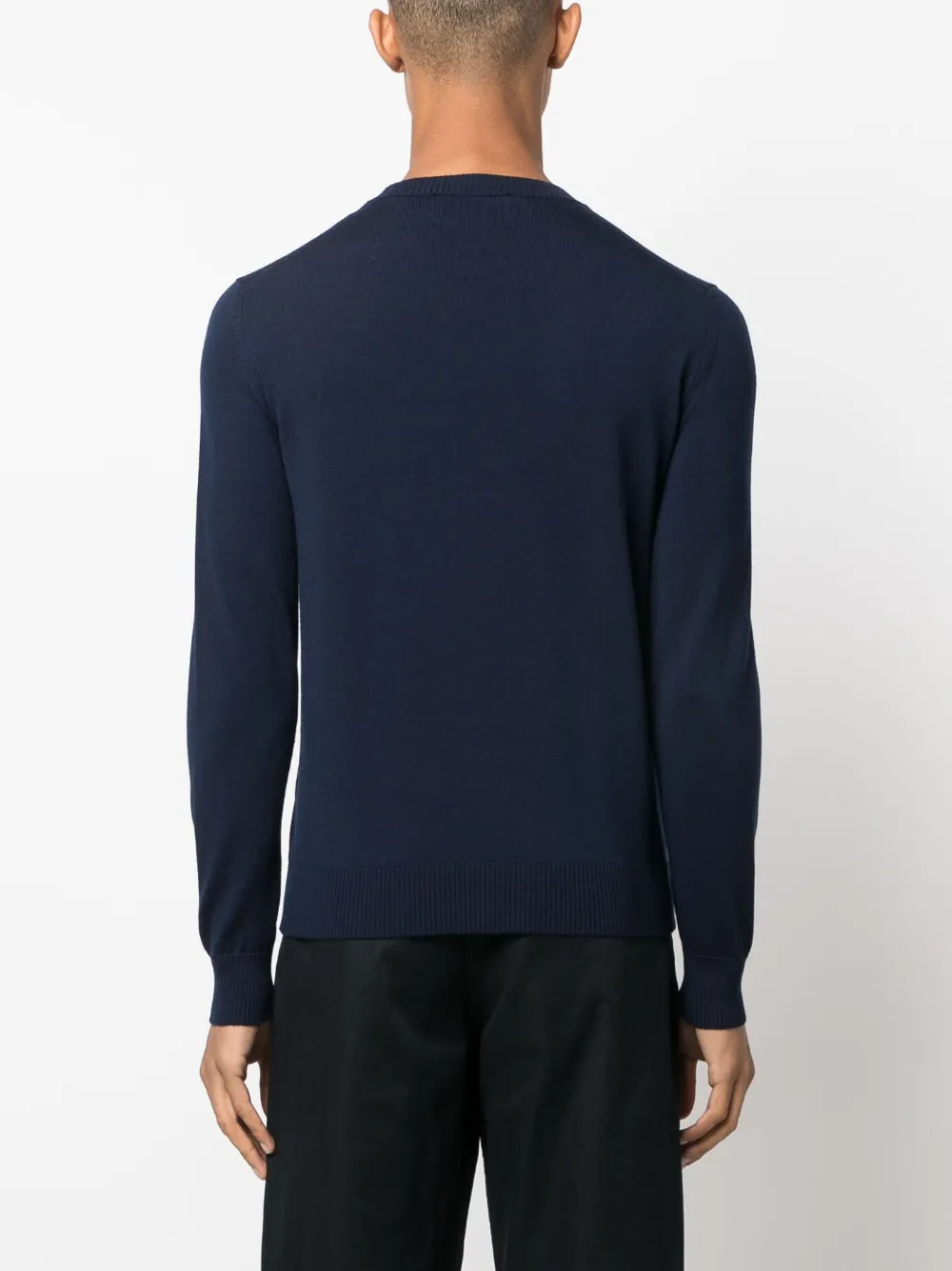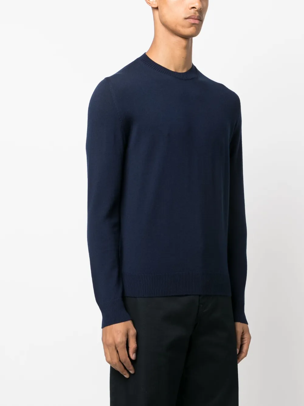 Темно-синий, тонкая вязка, круглый вырез, длинные рукава и манжеты в рубчик.