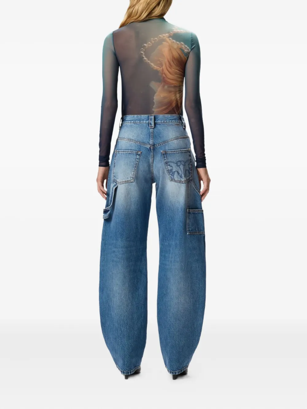 Сетчатая ткань цвета бирюзы с высоким воротом и длинными рукавами, с графическим принтом.