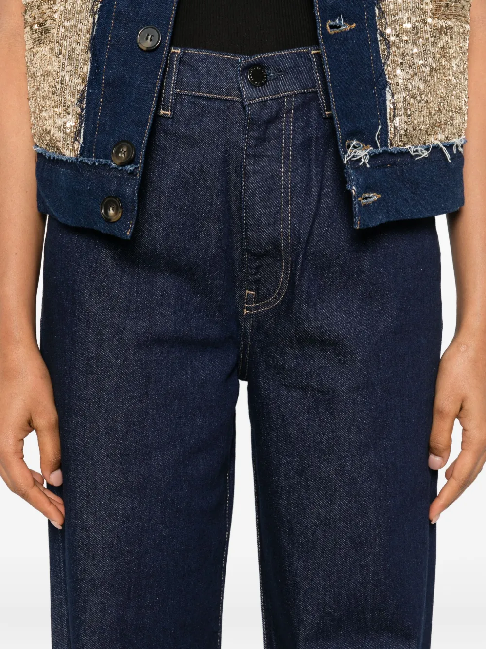 Темно-синий, с пятью карманами, застежкой на пуговицы и шлевками для ремня из хлопковой смеси.
