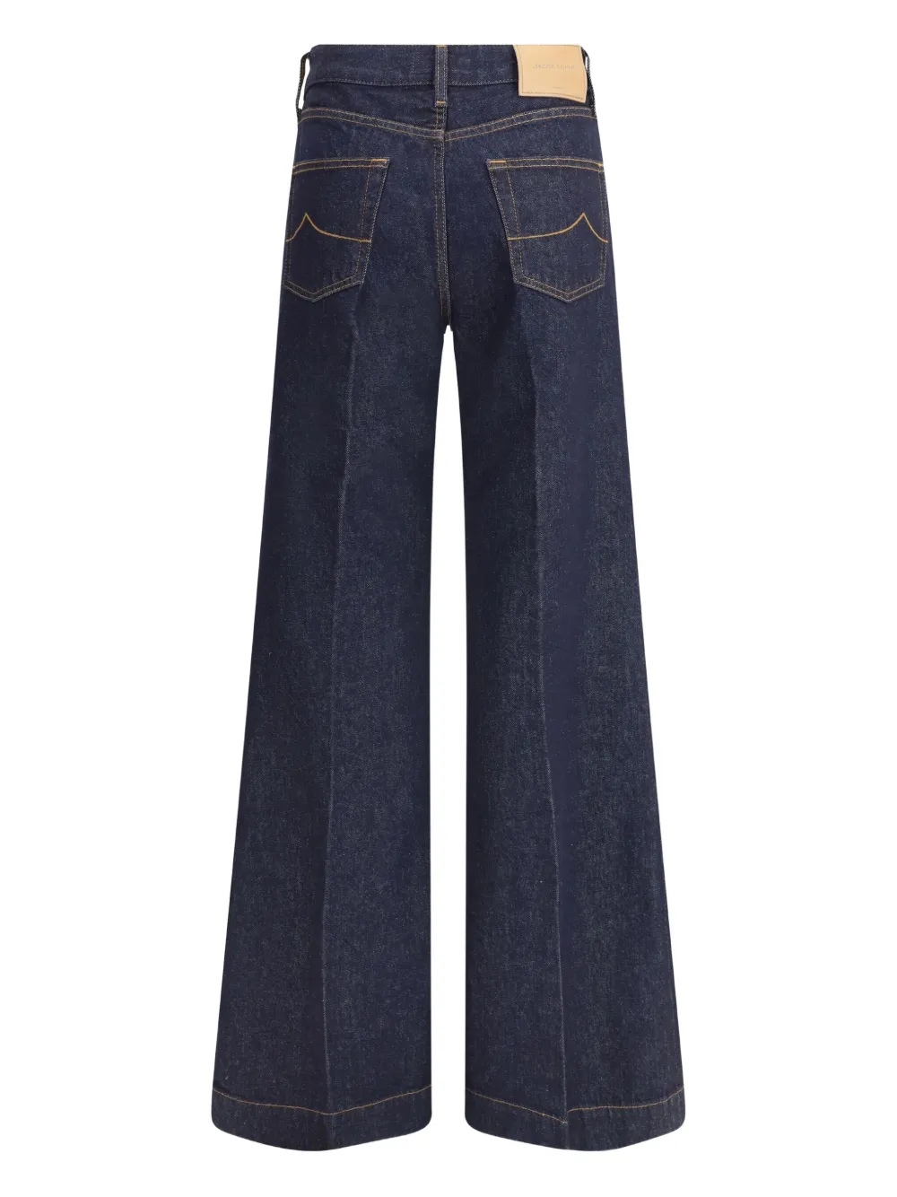 Темно-синий, пять карманов, кокетка сзади, оранжевая строчка.