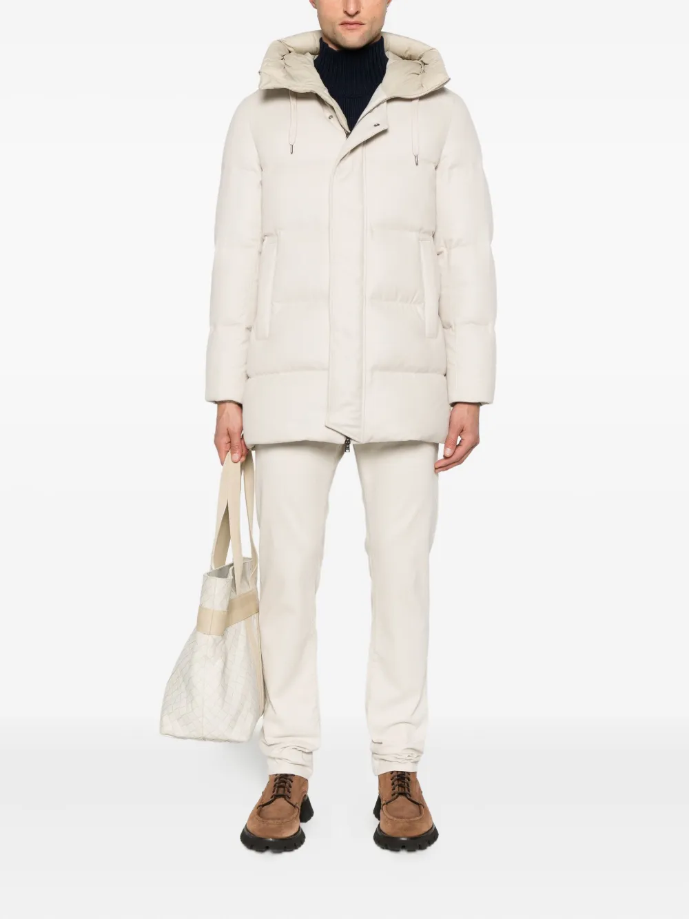 Белый, с пятью карманами, застежкой на пуговицы, шлевками для ремня и вышитым логотипом.