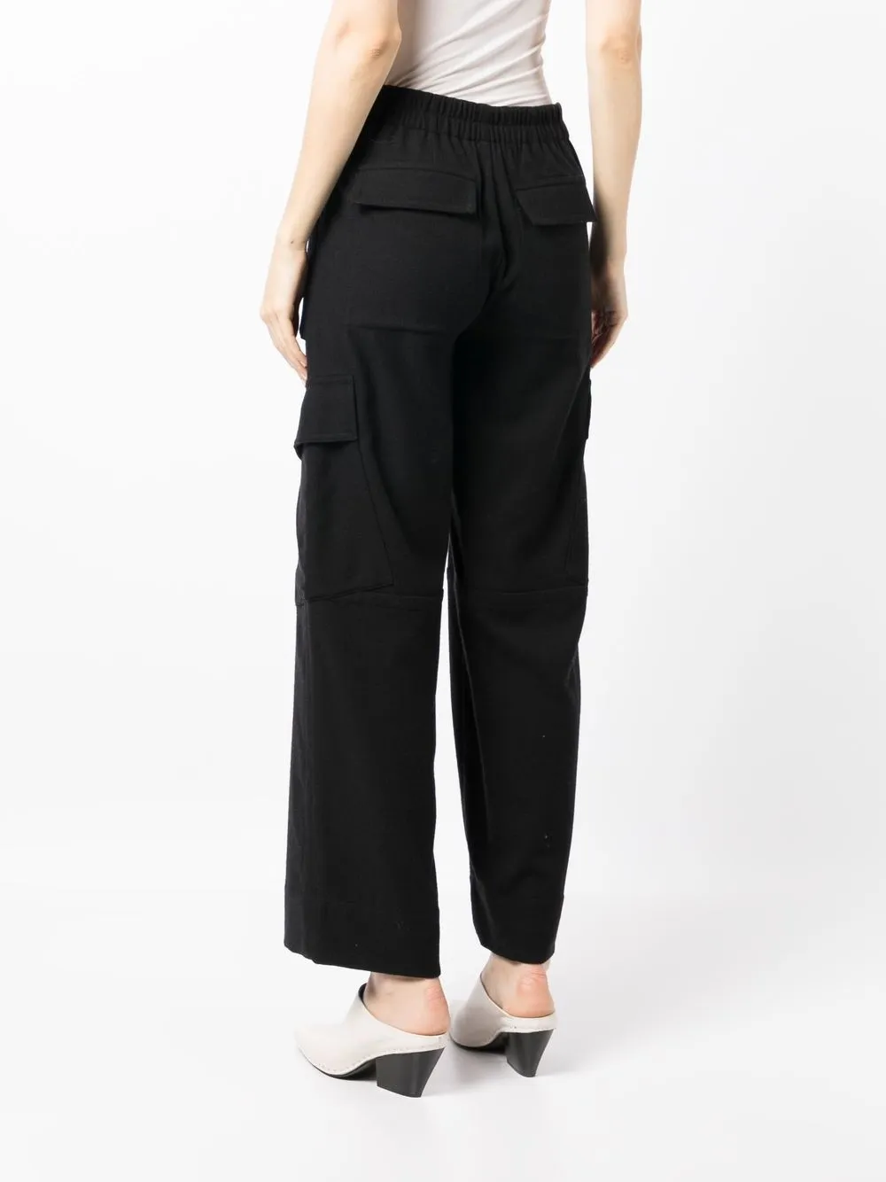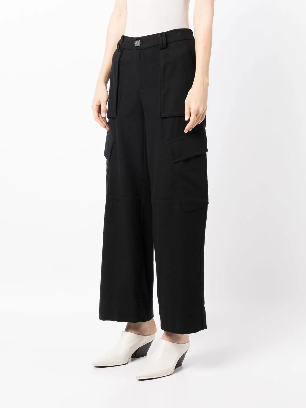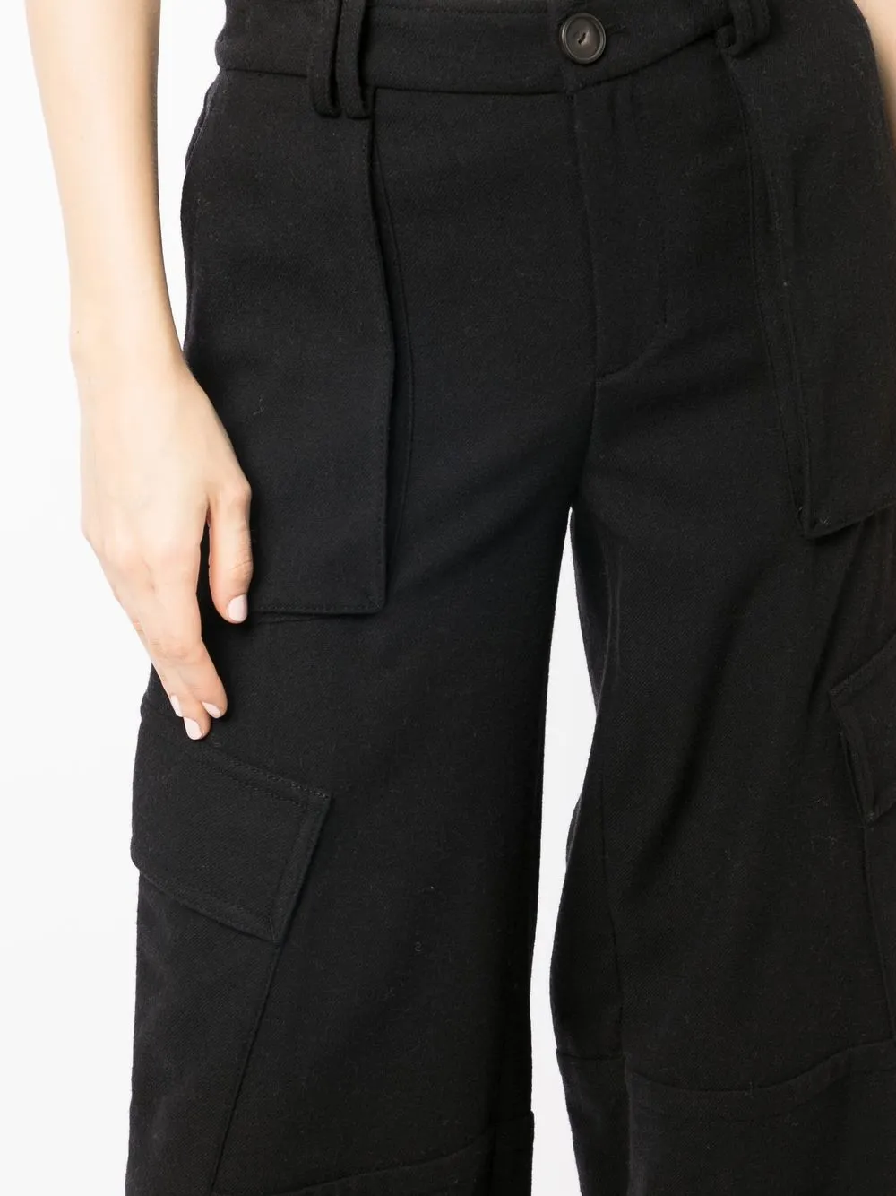 Черный, смесовая шерсть, петли для ремня, эластичный пояс, застежка на молнии и пуговице спереди, два кармана по бокам, два кармана с клапанами сзади, два кармана с клапанами по бокам и широкий крой.