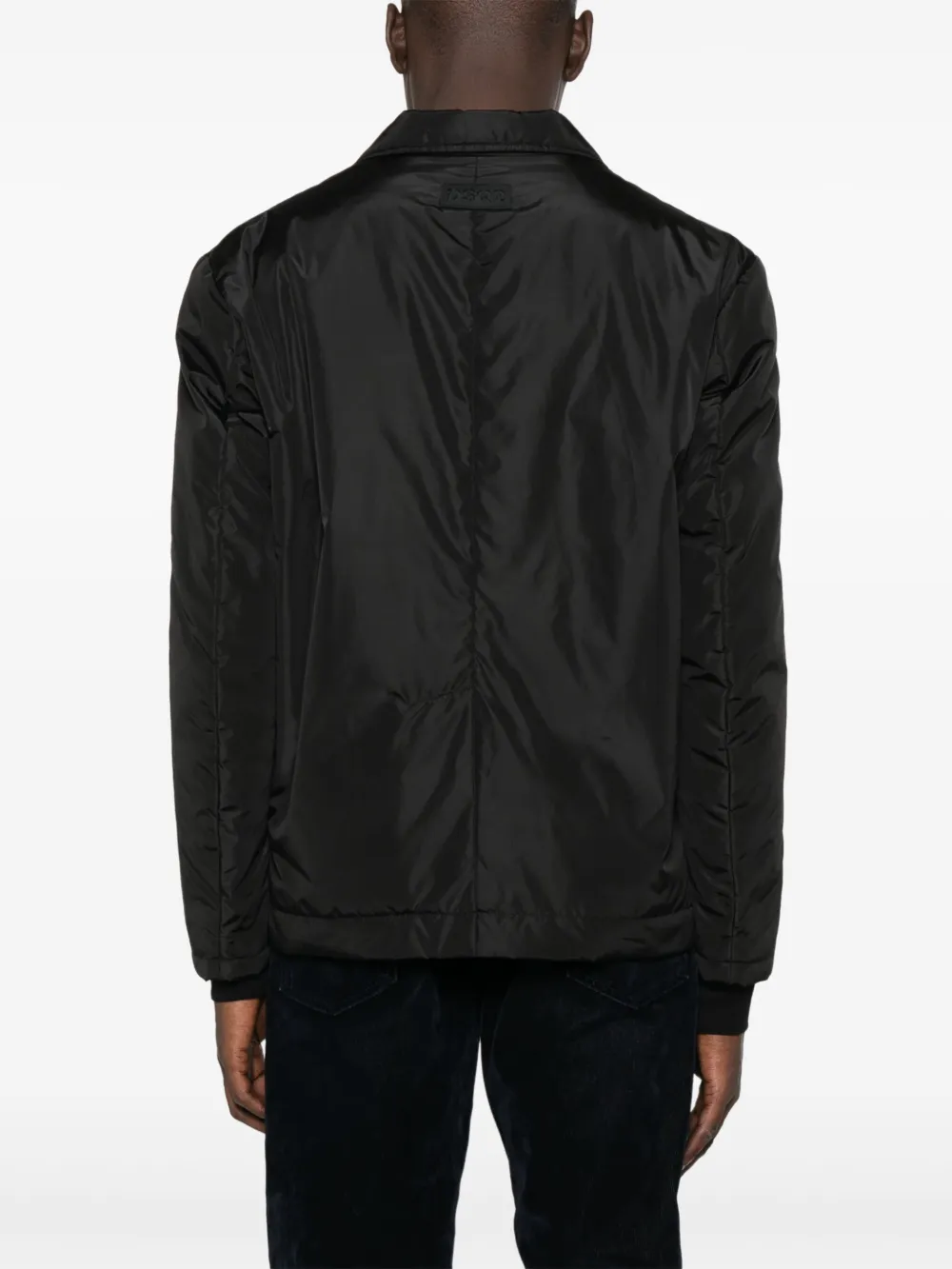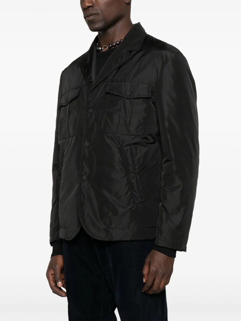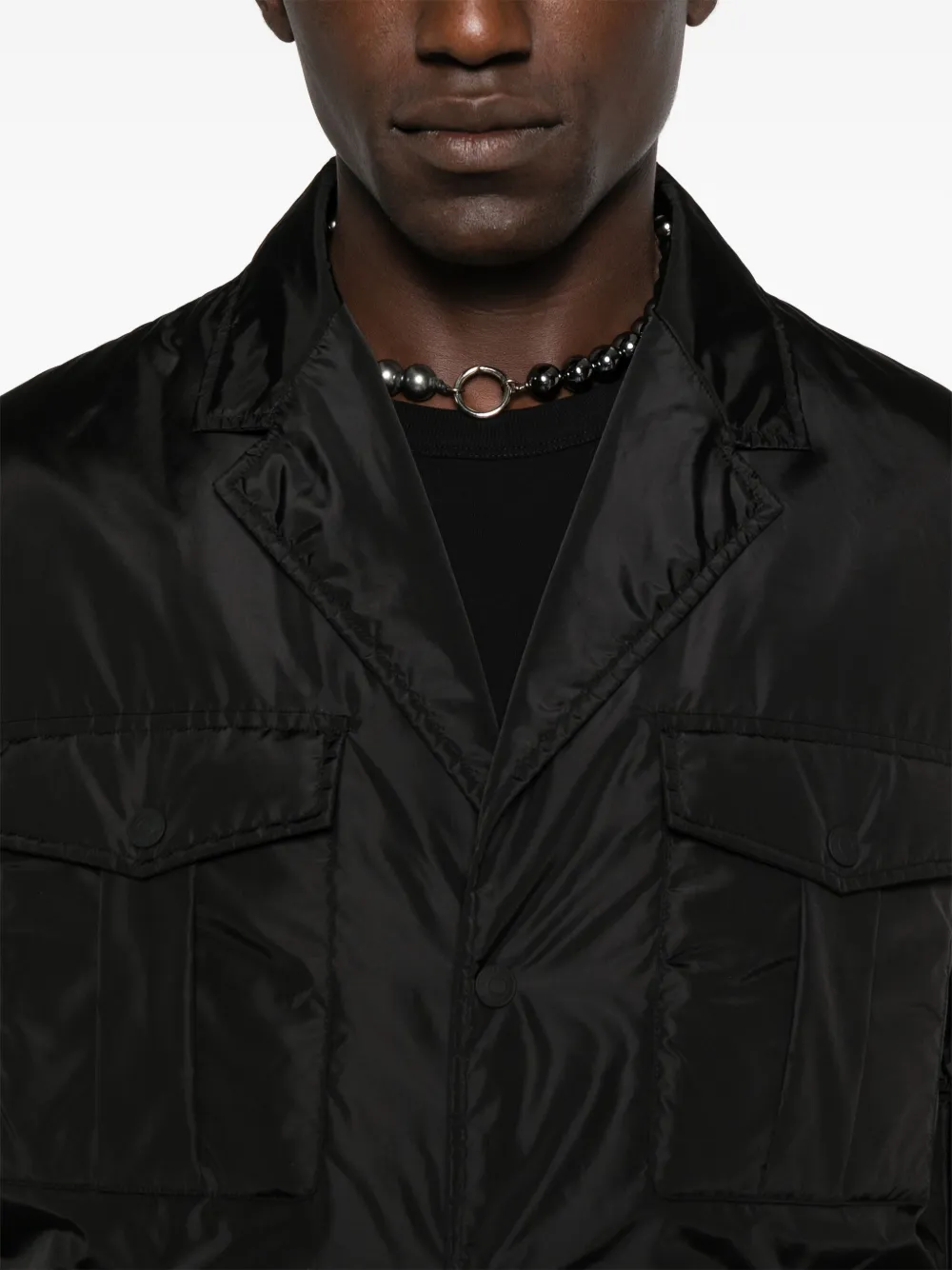 Черная застежка на пуговицы, карманы с клапанами, воротник-стойка, длинные рукава.