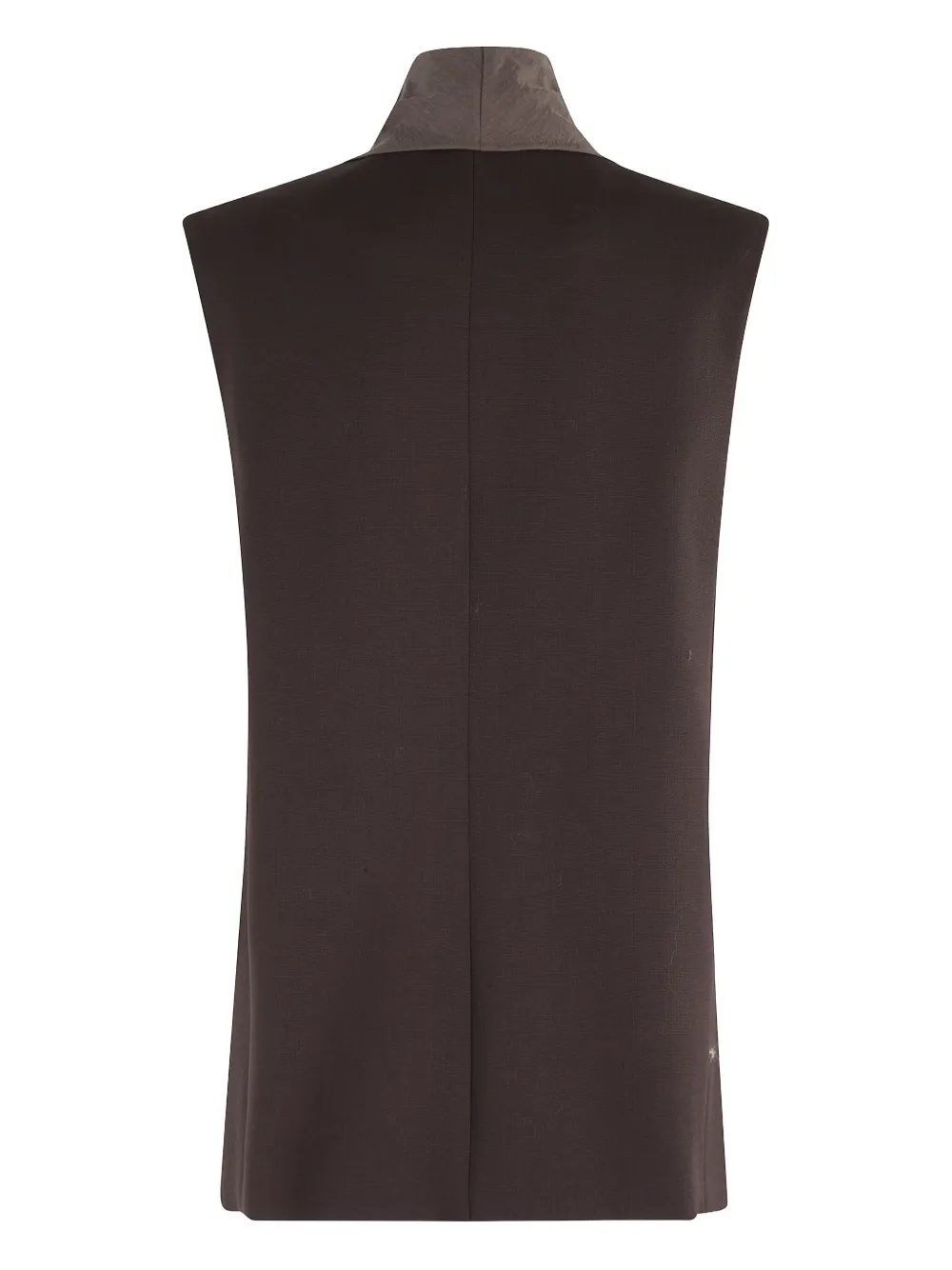 Коричневый шалевый воротник, без рукавов, прямой подол, карманы с клапанами