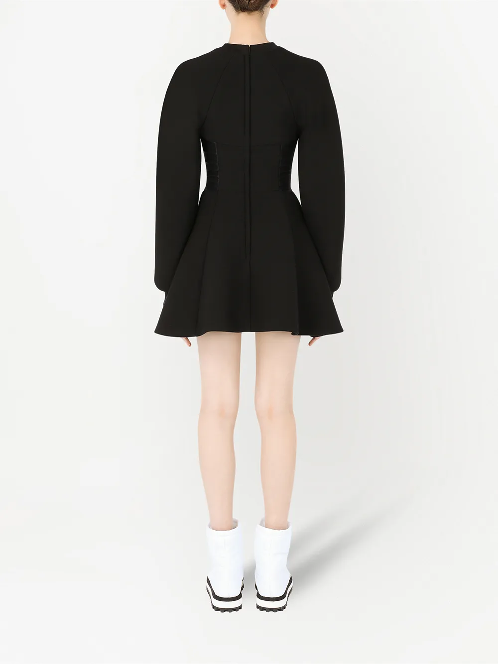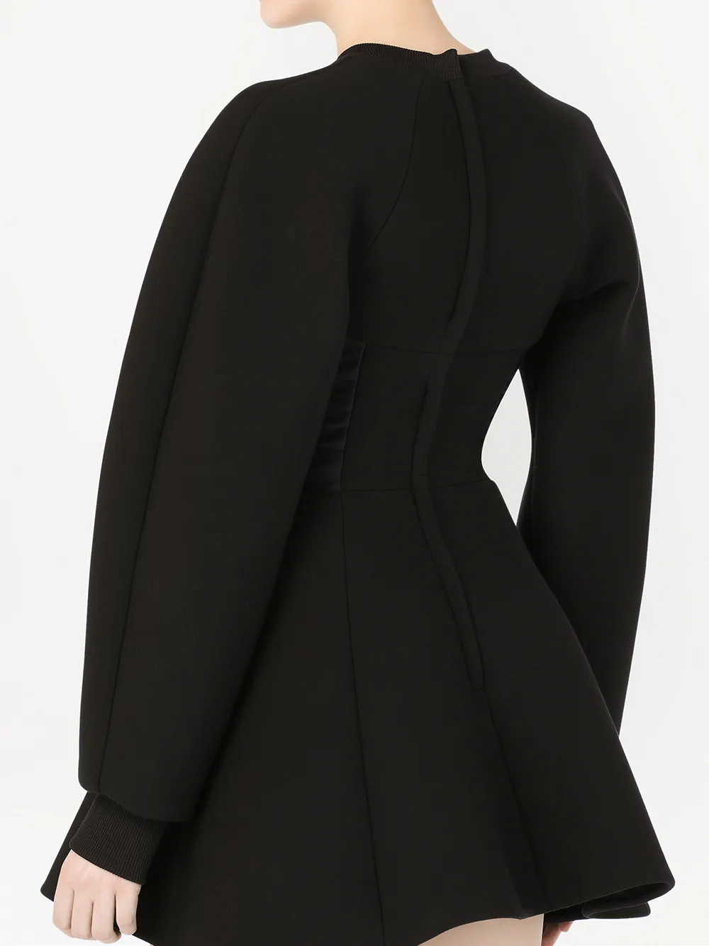 Эластичная модель, приталенный силуэт, объемная окантовка, круглый вырез, застежка на молнии сзади, длинные рукава реглан и расклешенная юбка. Цвет: черный.