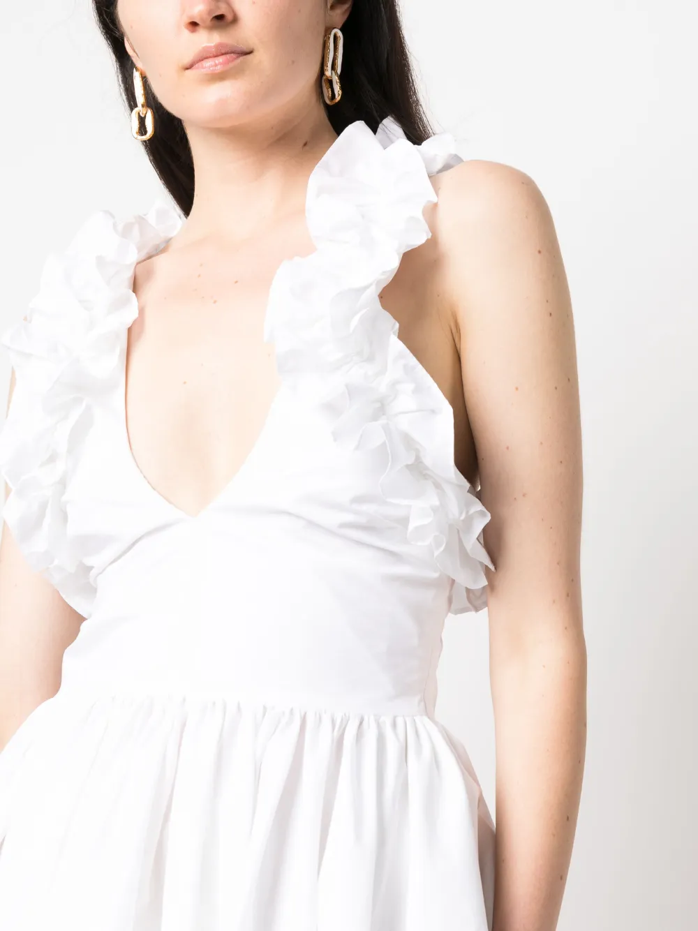 Белый, хлопок, глубокий V-образный вырез, потайная застежка на молнии сбоку, без рукавов, манжеты с оборками, расклешенная юбка и длина до бедер.