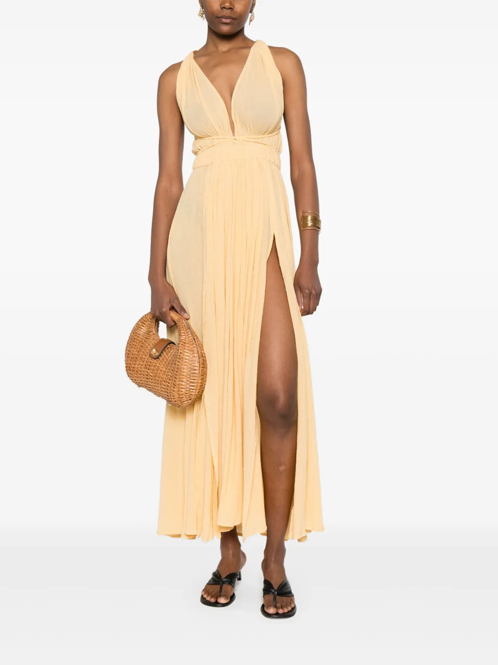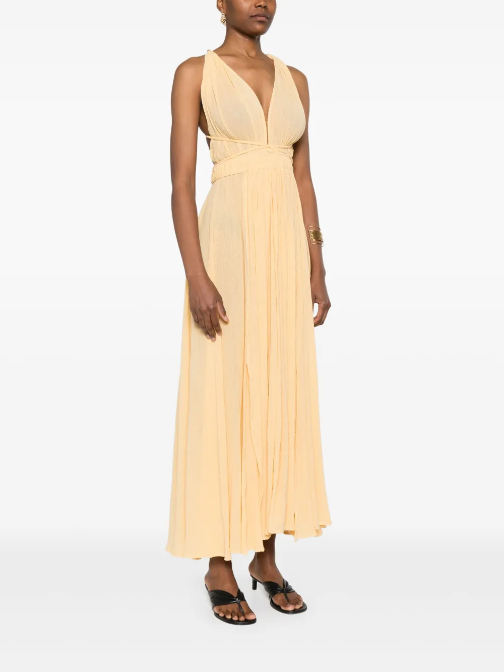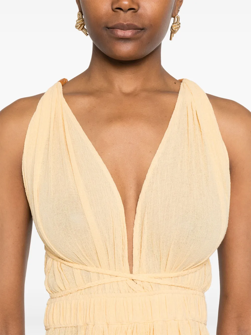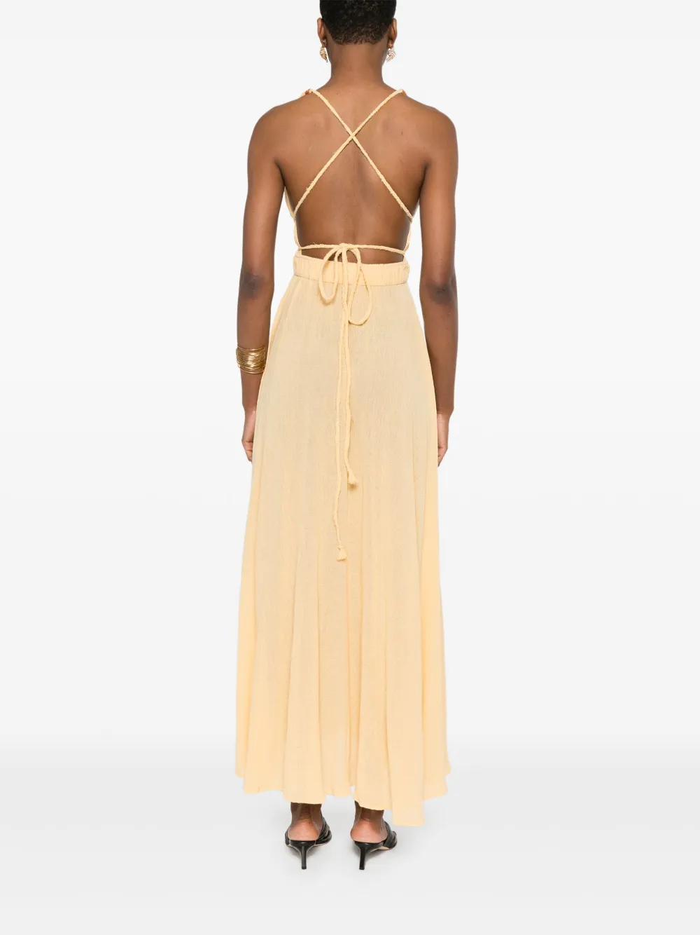 Светло-желтая завязка сзади, V-образный вырез сзади, перекрещивающиеся бретели, без рукавов.