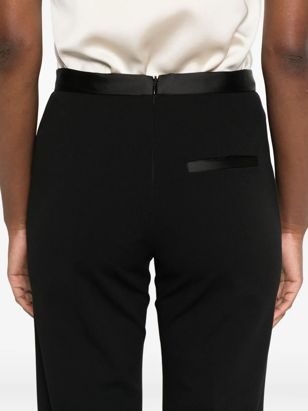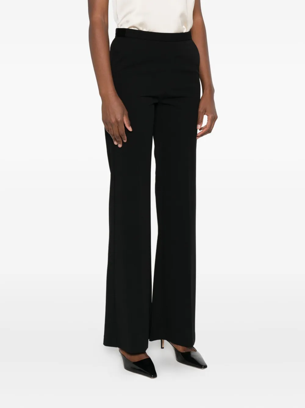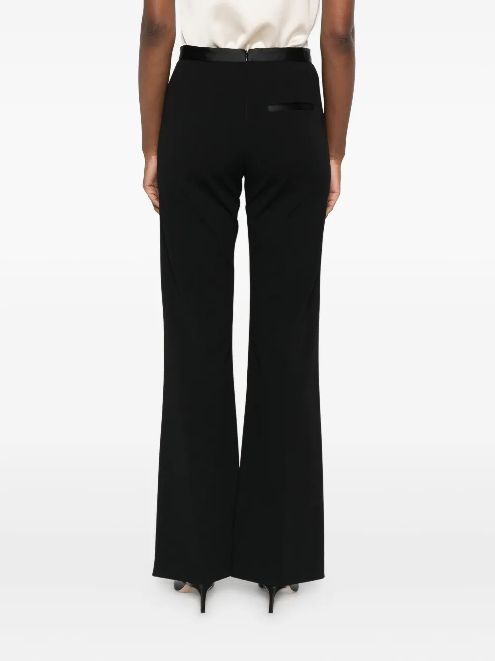 Черный, с высокой талией, боковыми карманами, застежкой-молнией, центральным швом сзади, расклешенными брючинами.
