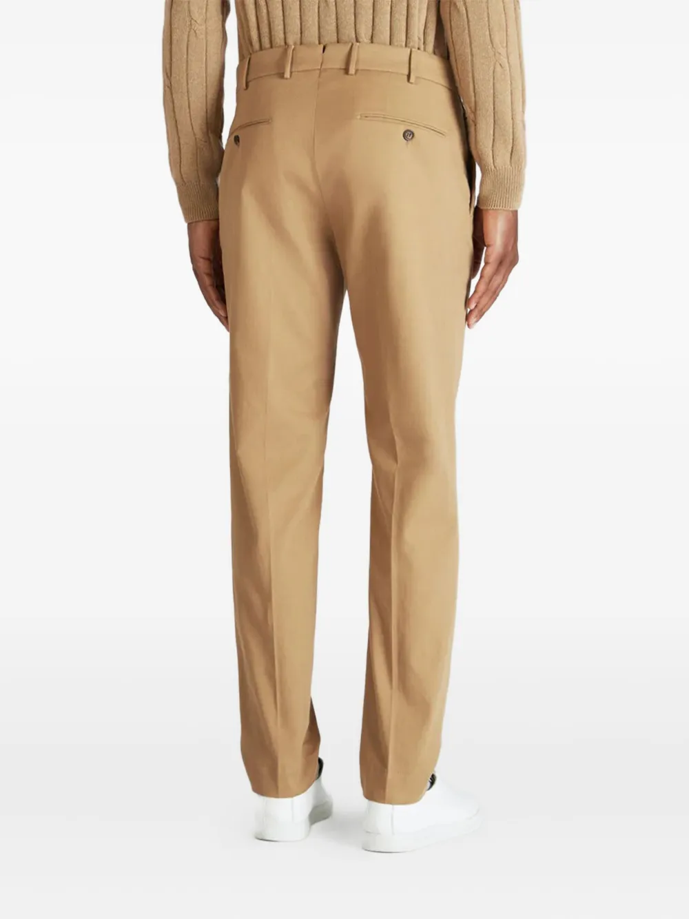 Светло-коричневые плоские передние застежки на пуговицы, боковые карманы, задние карманы.