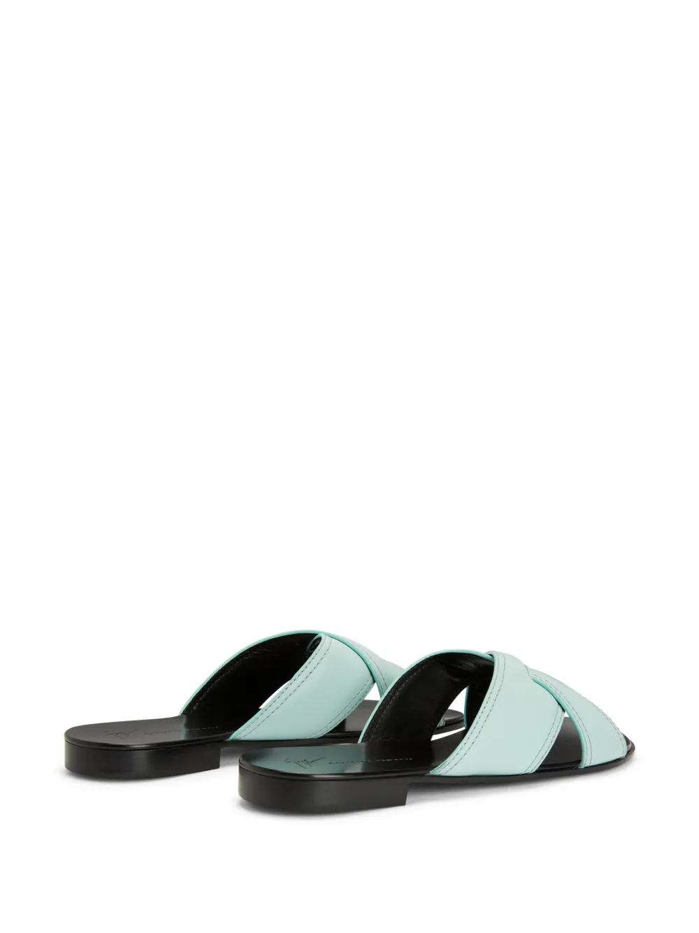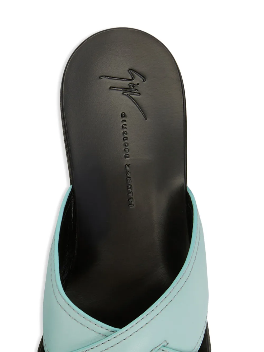 Голубой, кожа, закругленный открытый носок, модель без застежки, перекрестные ремешки, стелька с логотипом и плоская кожаная подошва.