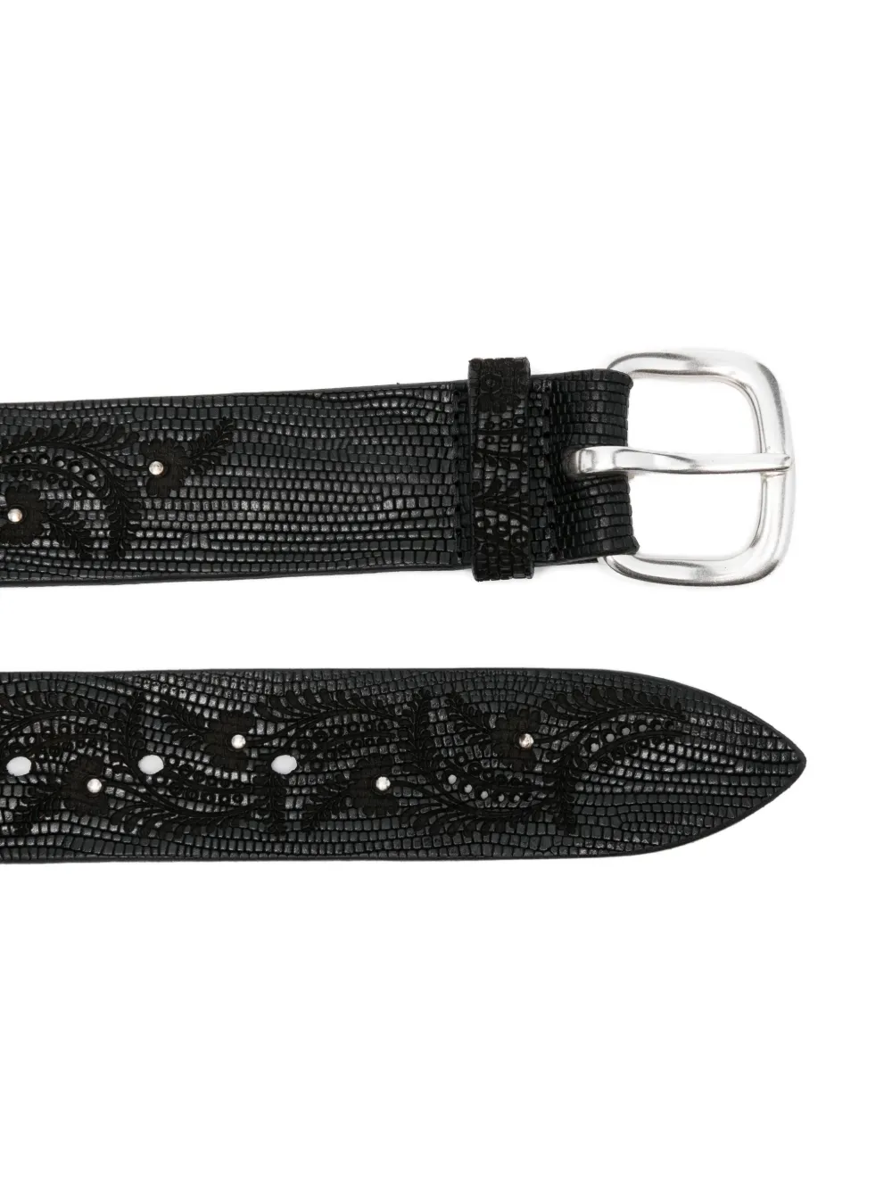 Черная телячья кожа, цветочный мотив, заклепки, серебристая пряжка, прямоугольная пряжка
