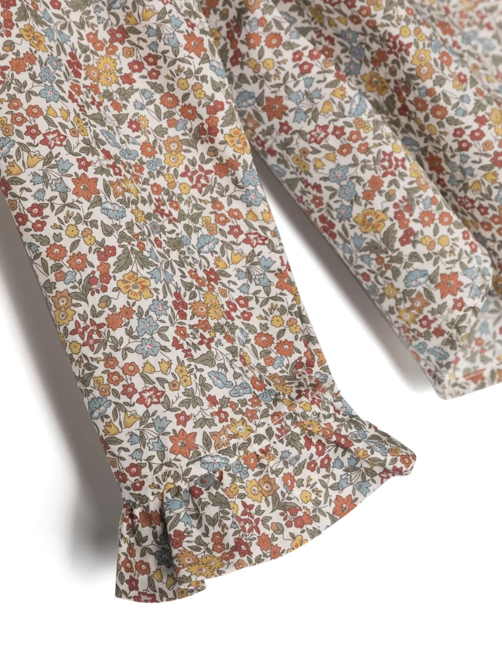 Оранжевый, разноцветный, хлопок, сплошной цветочный принт, воротник с оборками, застежка на пуговицах спереди, длинные рукава, манжеты с оборками и закругленный подол.