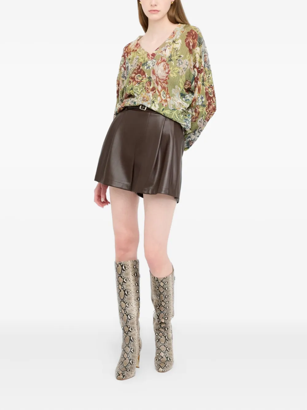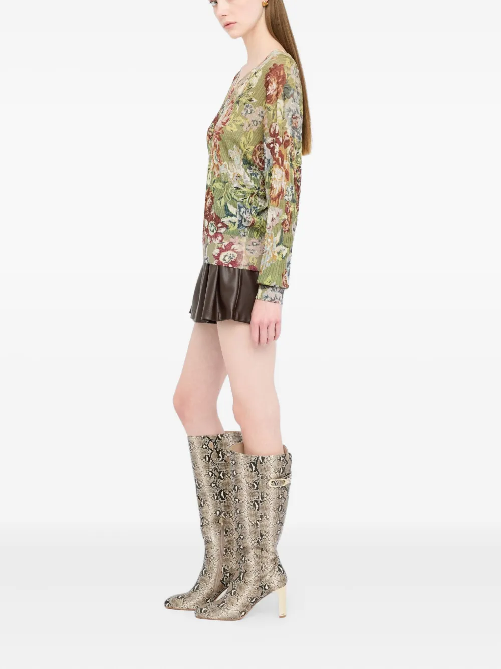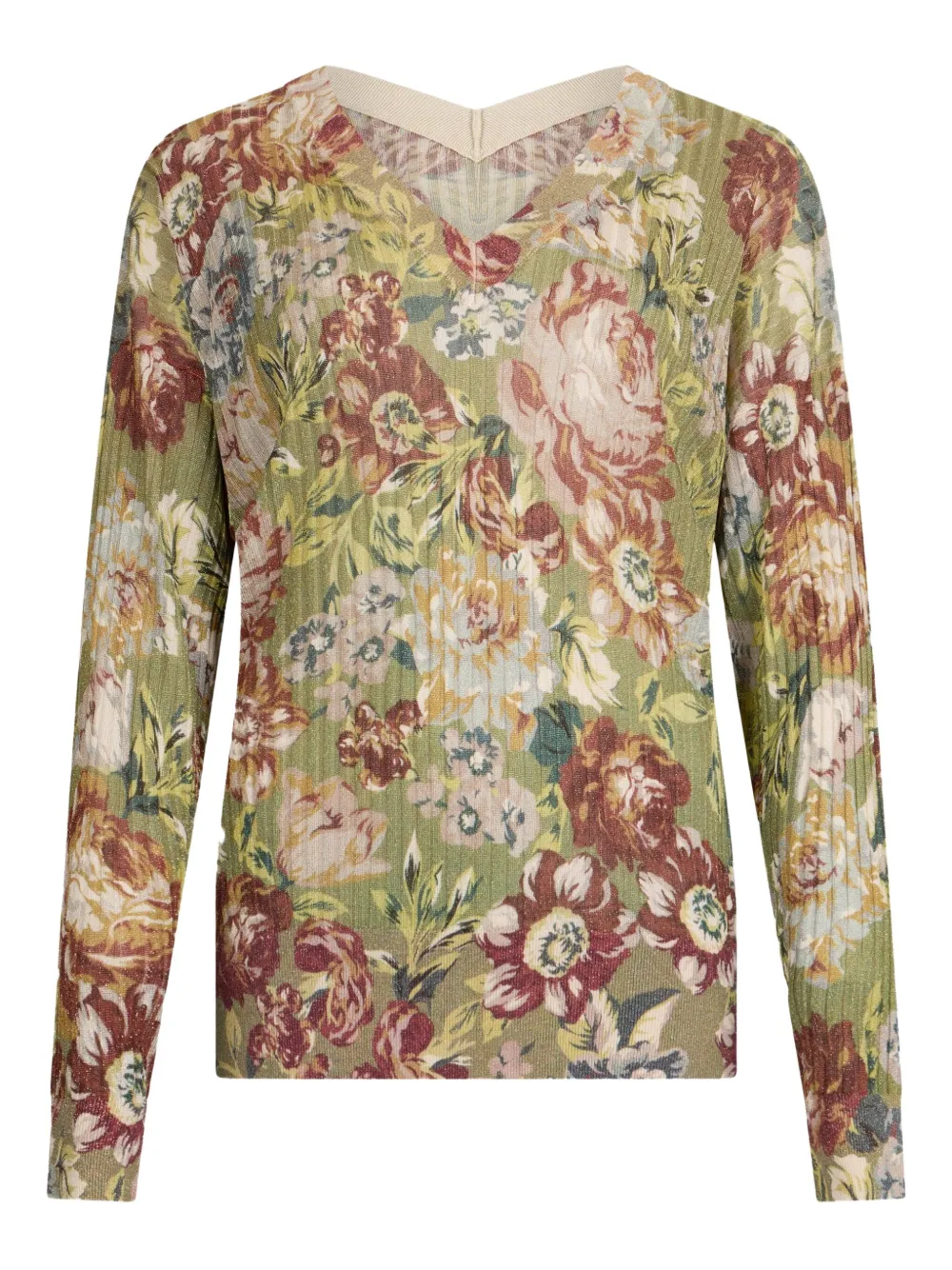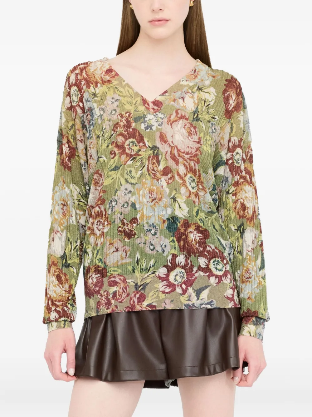Светло-оливково-зеленая резинка с люрексом, V-образный вырез, цветочный принт по всей поверхности, длинные рукава