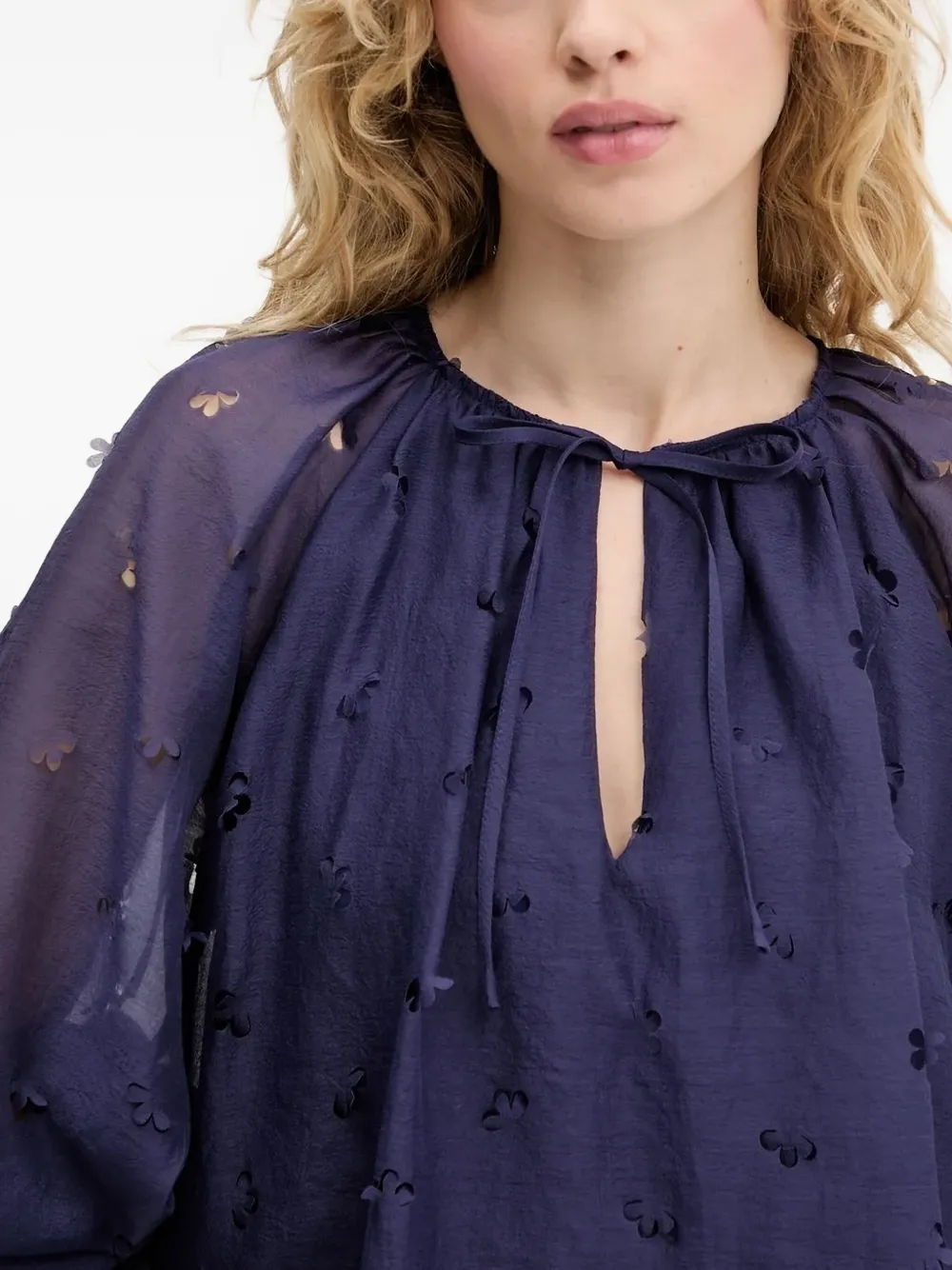 Темно-синие цветочные вырезы, вырез-блуза, длинные рукава, рукава-фонарики, эластичные манжеты.