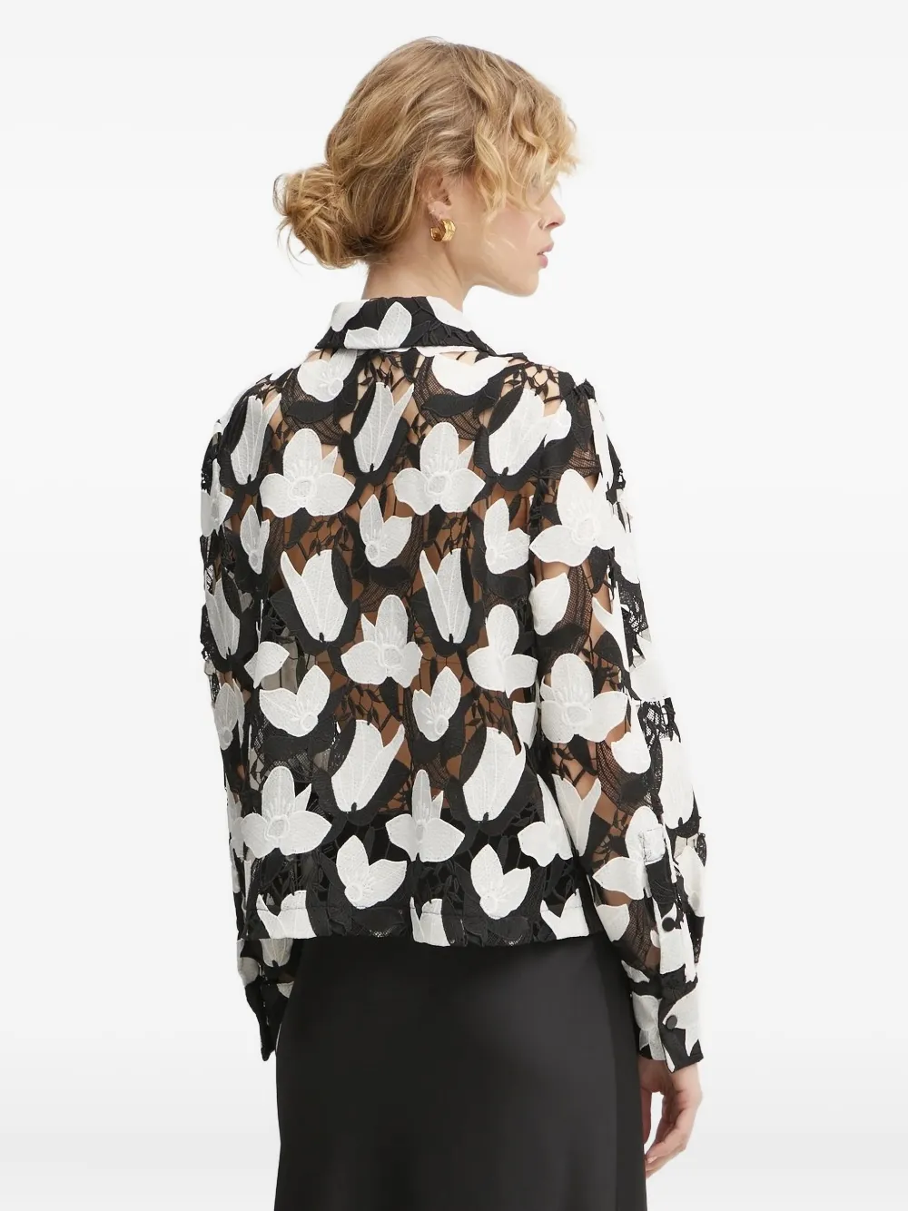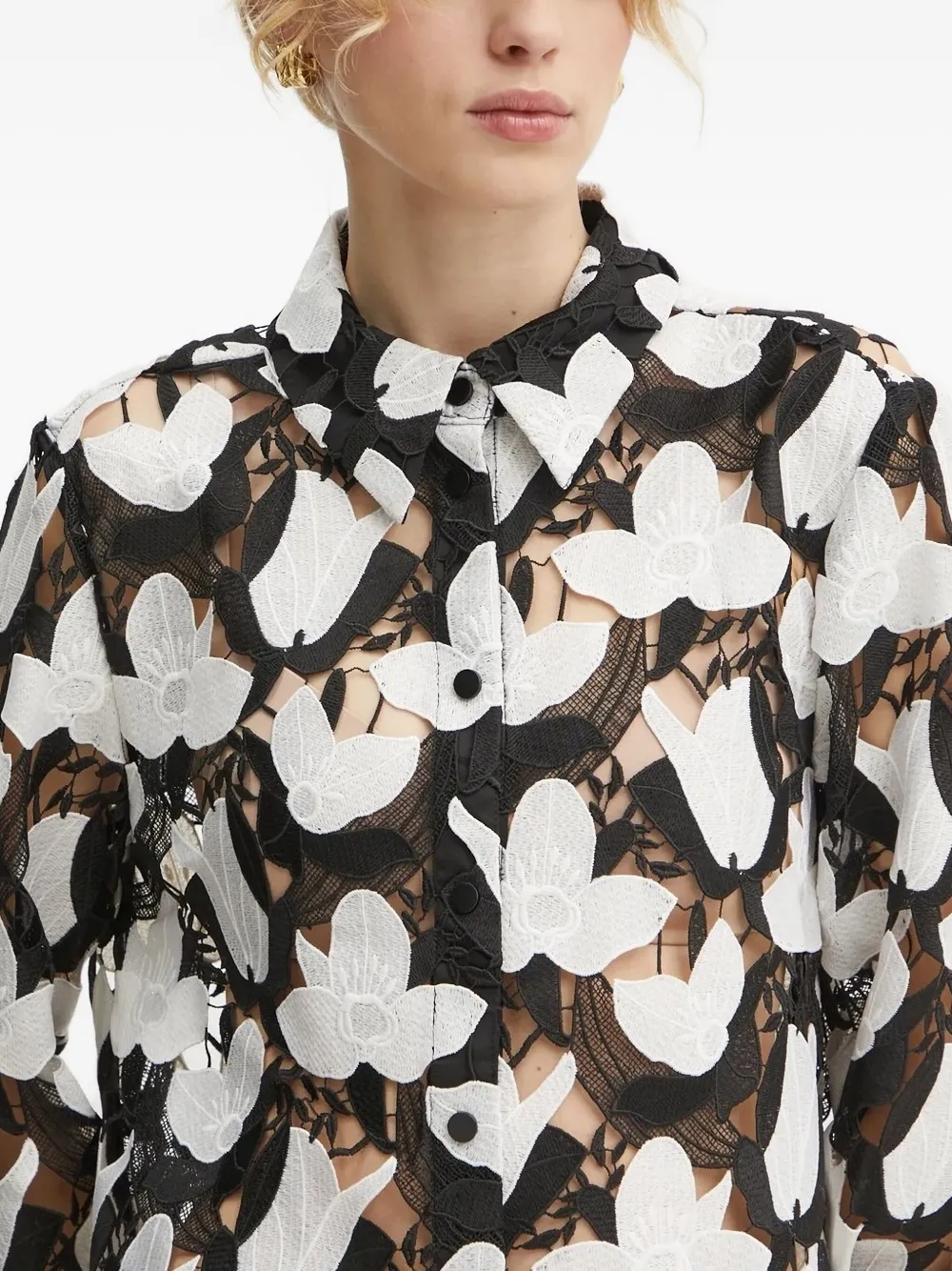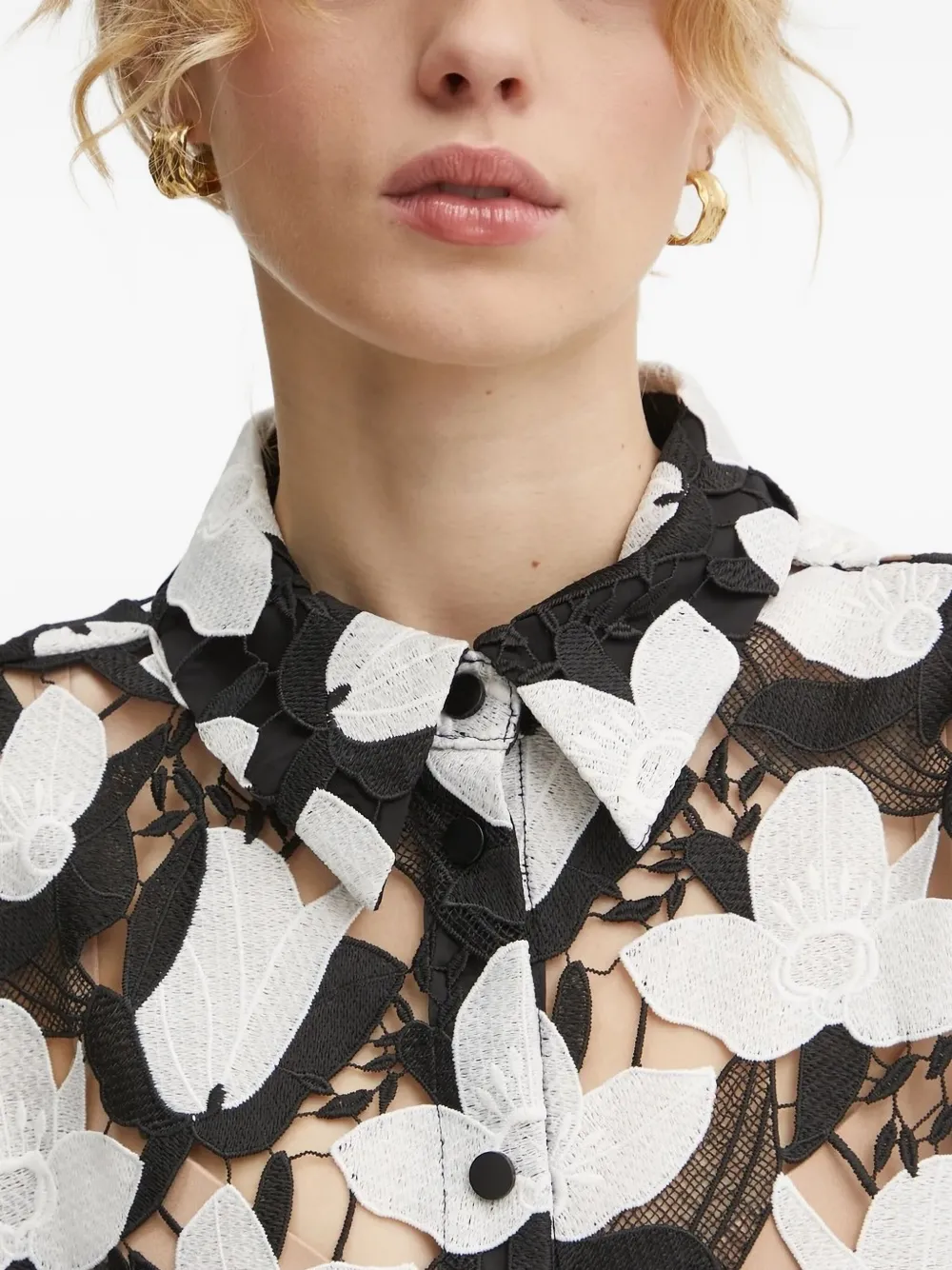 Черно-белый цветочный кружевной узор, застежка на пуговицы, длинные рукава, классический воротник.