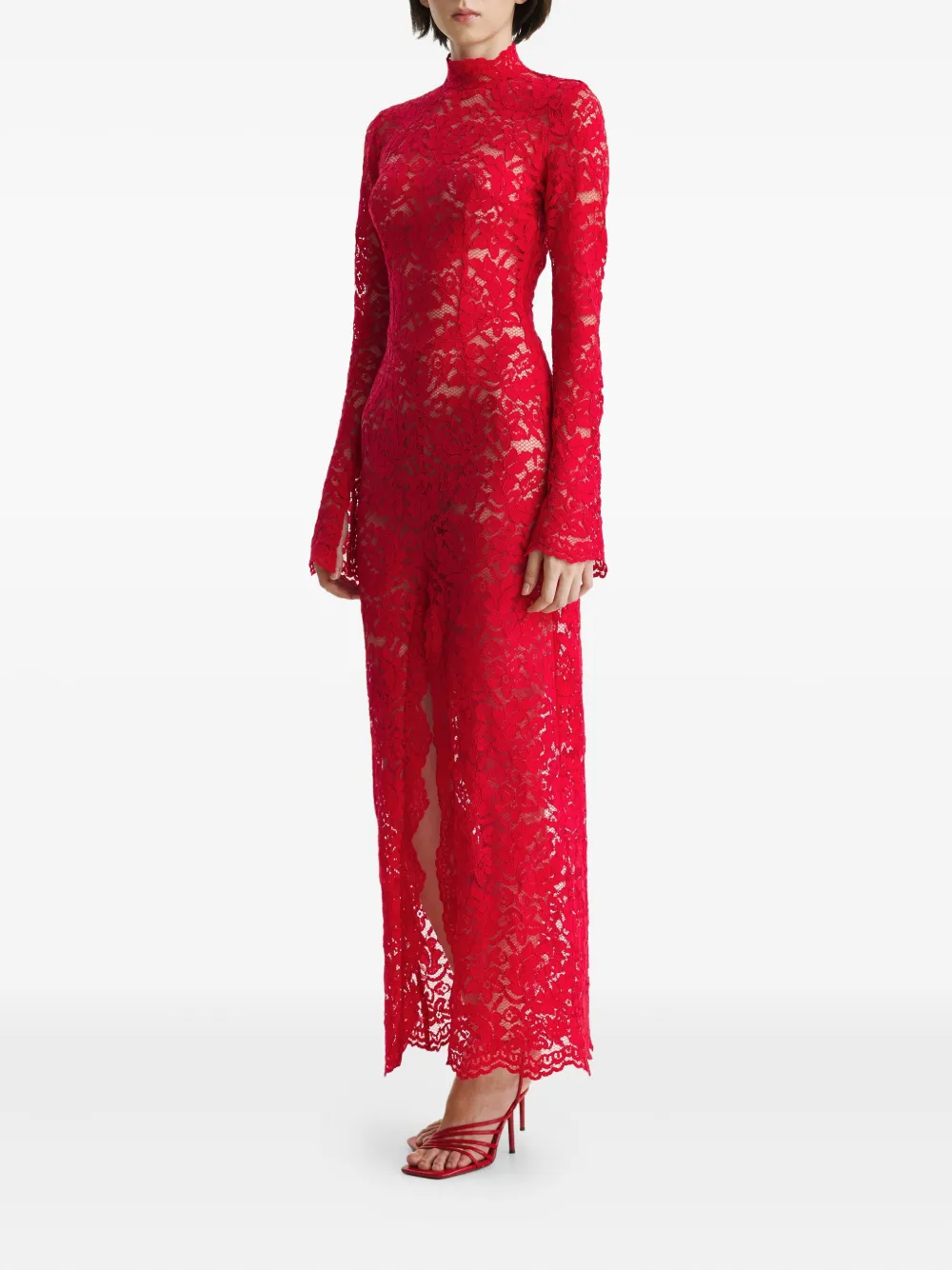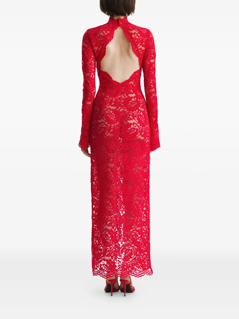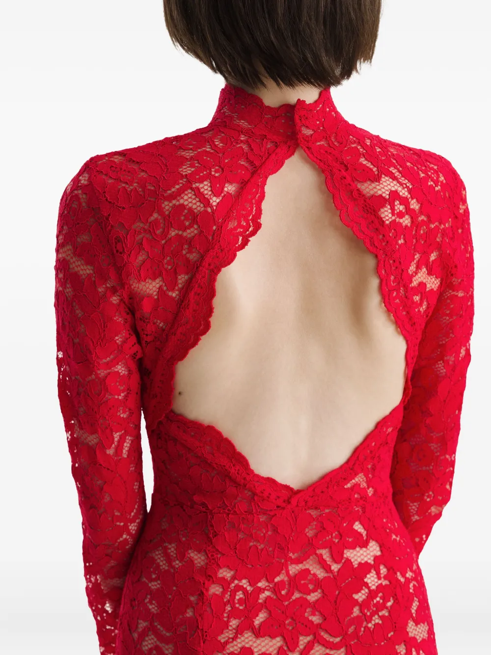 Красная водолазка с цветочным кружевным узором, длинными рукавами, открытой спиной и разрезом спереди.