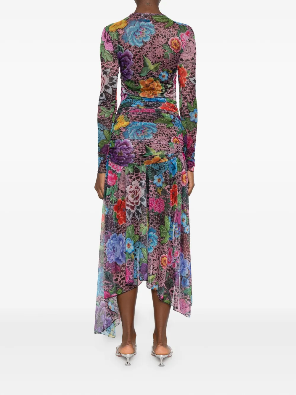 Розовый и разноцветный цветочный принт, асимметричный подол, длинные рукава, присборенная талия.