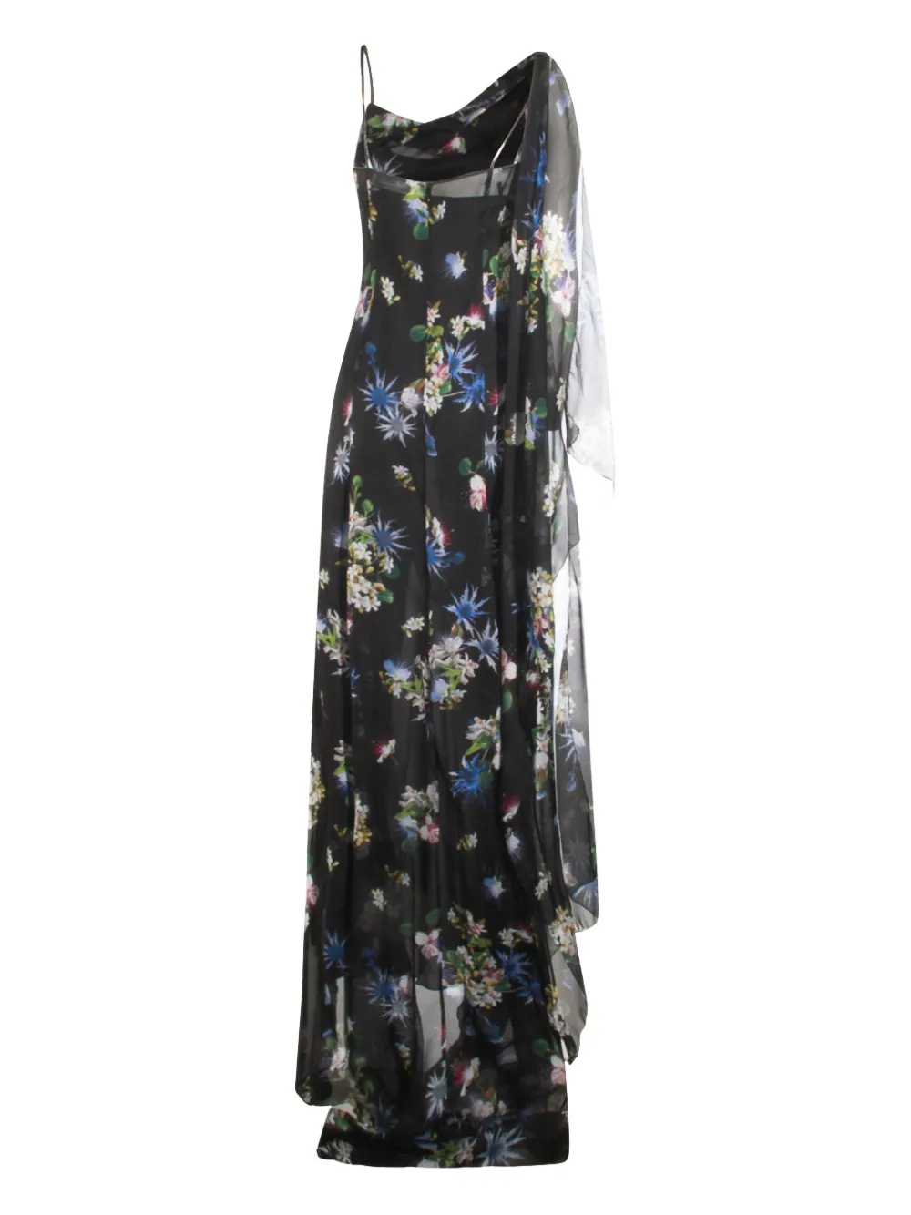 Черный цветочный принт, воротник-хомут, бретелька на одно плечо, драпированные рукава, асимметричный подол