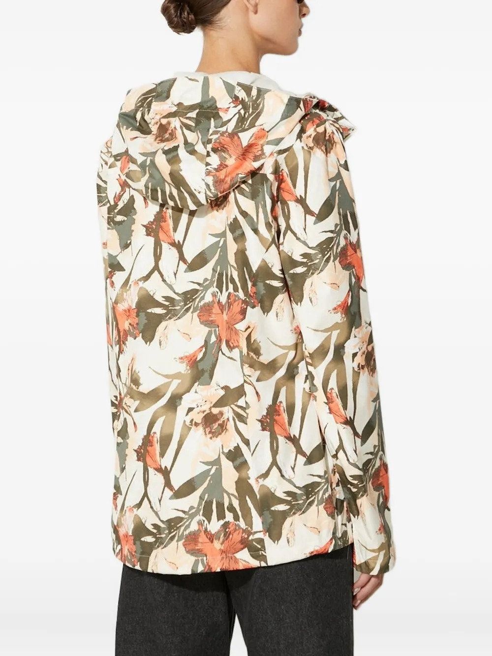 Белый цветочный принт, молния спереди, капюшон, вырез горловины, длинные рукава.