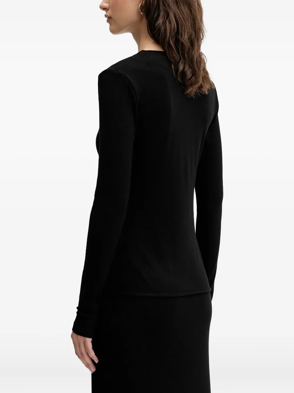 Черная ребристая фактура, цветочный принт, застежка на пуговицы спереди, длинные рукава.