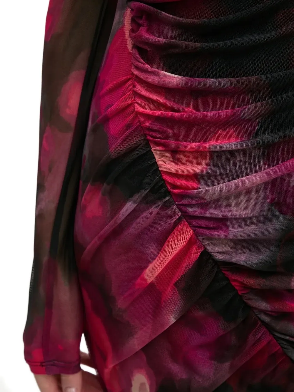 Черно-розовый абстрактный цветочный принт, сборчатые детали, длинные рукава, сетчатая ткань, асимметричный вырез.