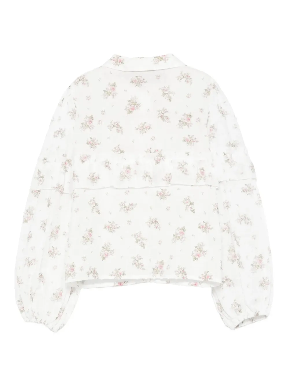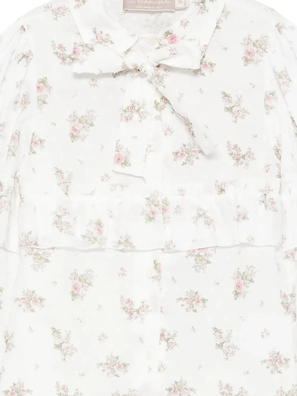 Белый цветочный принт, оборки, застежка на пуговицы, длинные рукава, рукава-фонарики, галстук