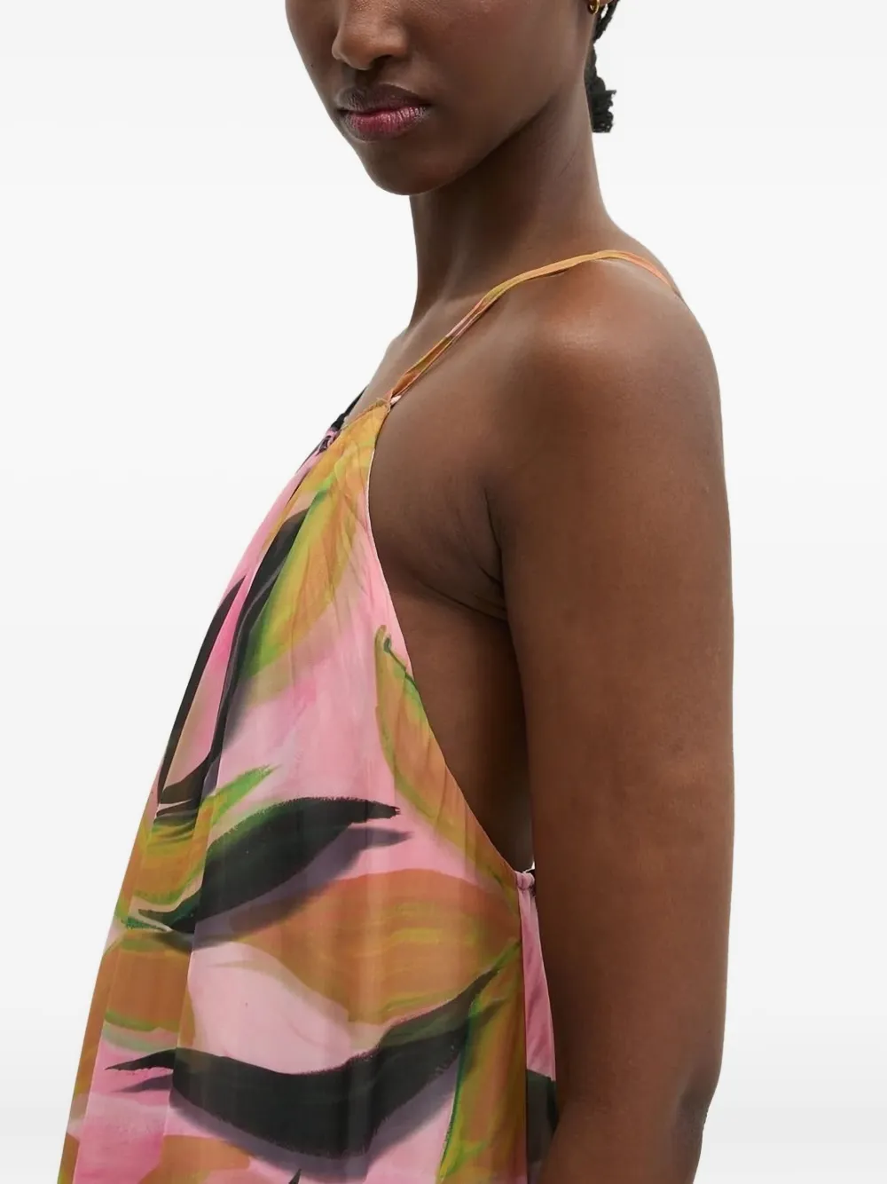 Юбка с абстрактным цветочным принтом, тонкими бретельками, многоуровневая, с открытой спиной и присборенным вырезом.