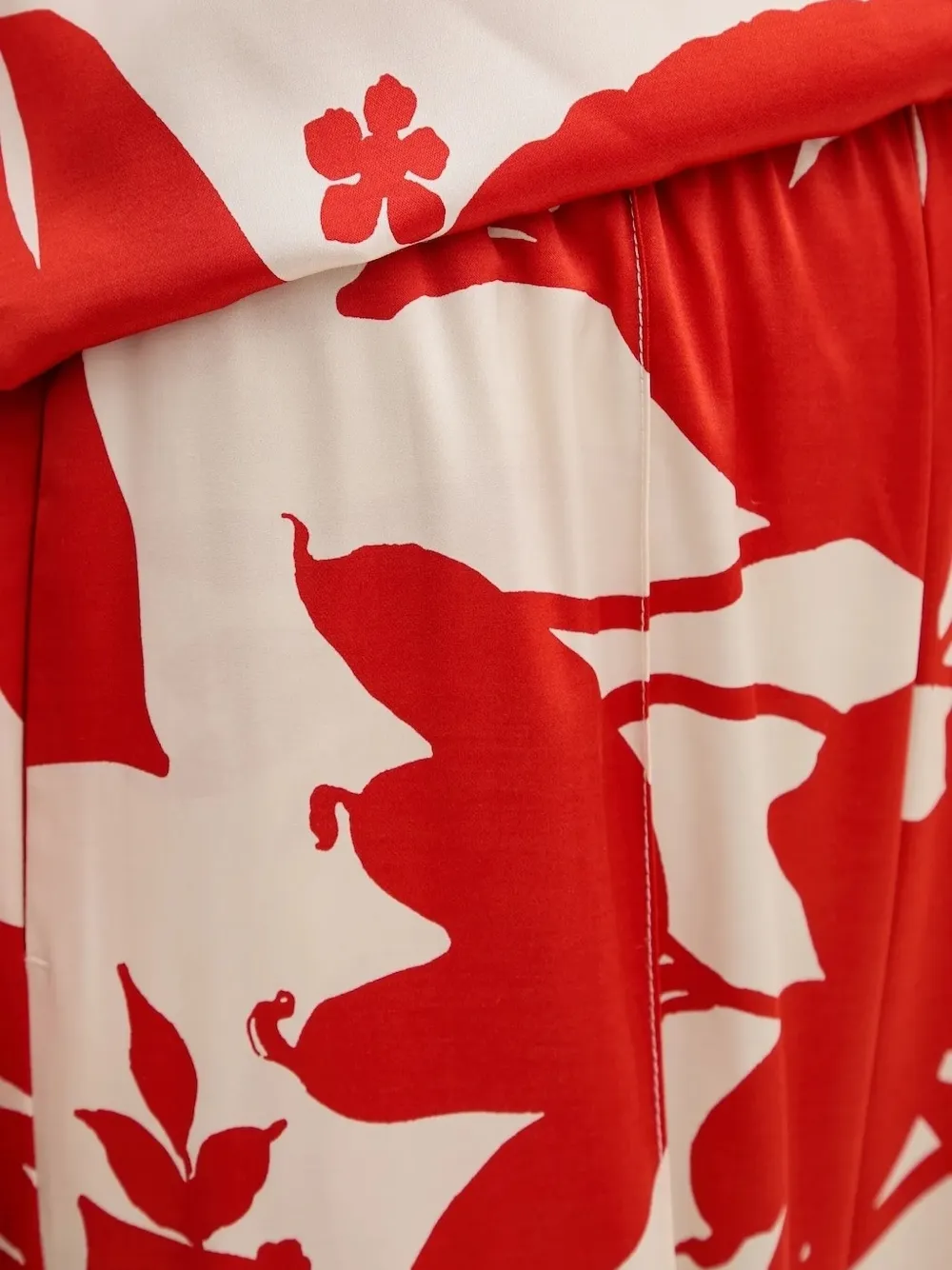 Эластичный пояс с красным цветочным узором, прямой подол, атласная текстура