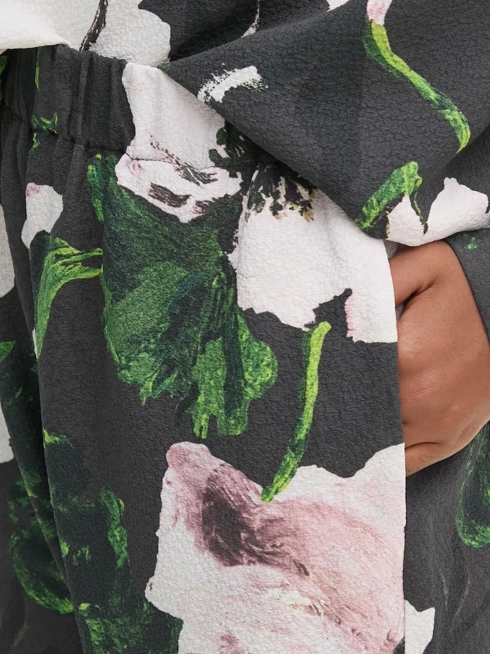 Черный цветочный принт, широкие штанины, эластичный пояс, боковые карманы, высокая талия